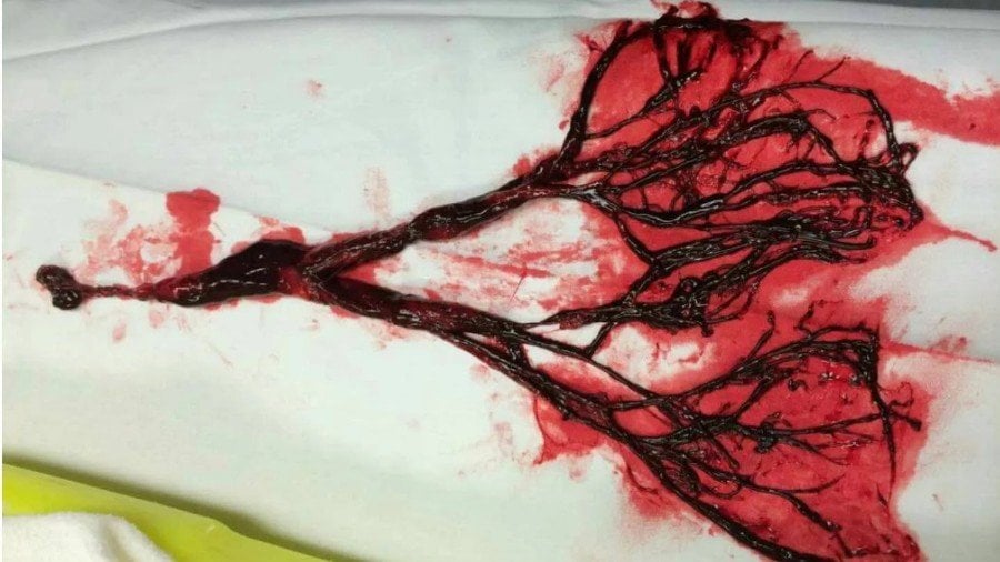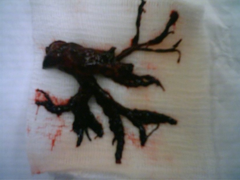Fotoğraf muhtemelen gerçek diyoruz, çünkü gerçekten de ciğerleri dolduran kan pıhtıları buna benzer şekillerde oluşuyor. Normalde genellikle bu kadar iri ve uzun olmasalar da, şekil olarak buna son derece benzer pıhtıları görmek mümkün.