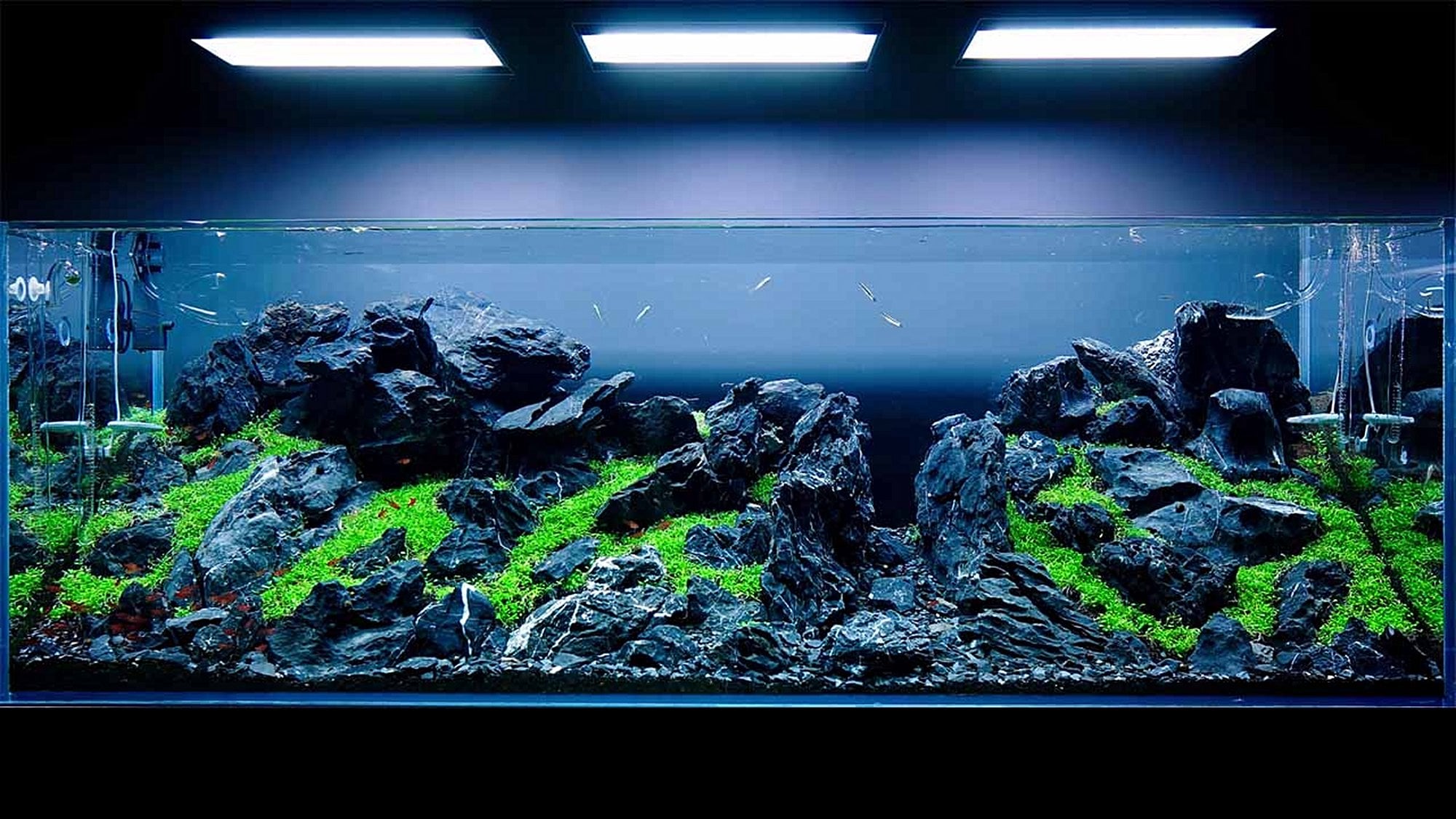 - Bitkili akvaryumlarda ışık şiddetinin homojen dağılımı için aydınlatmanın yüksekten asılması gerekir ancak bu durumda ışık kaybını önlemek için güçlü ve kaliteli aydınlatma sistemleri kullanılmalıdır.