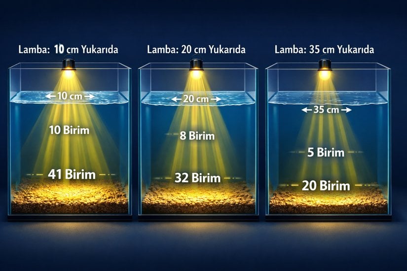 Birçok kişinin atladığı nokta, temel olarak bu prensipte yatıyor. Pek çok kişi aydınlatmayı su yüzeyine çok yakın tutuyor ve bir türlü çözemediği bitki yetiştirme problemleri yaşıyor. Bazı (uzun) bitkiler büyürken tabanda kalanlar çürüyor. Demek ki tabana yeterli ışık gitmiyor deyip ışığı artırdığında da bu sefer yosun problemi başlıyor.