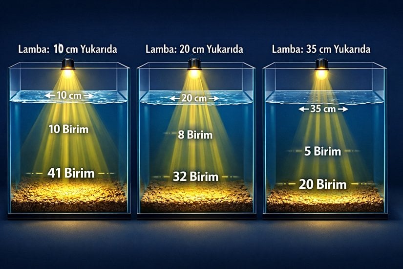 - Işık şiddeti mesafe arttıkça mesafenin karesiyle ters orantılı olarak azalır, bu yüzden su yüzeyine yakın yerleştirilen aydınlatmalar akvaryum tabanına yeterince ışık ulaştıramaz.