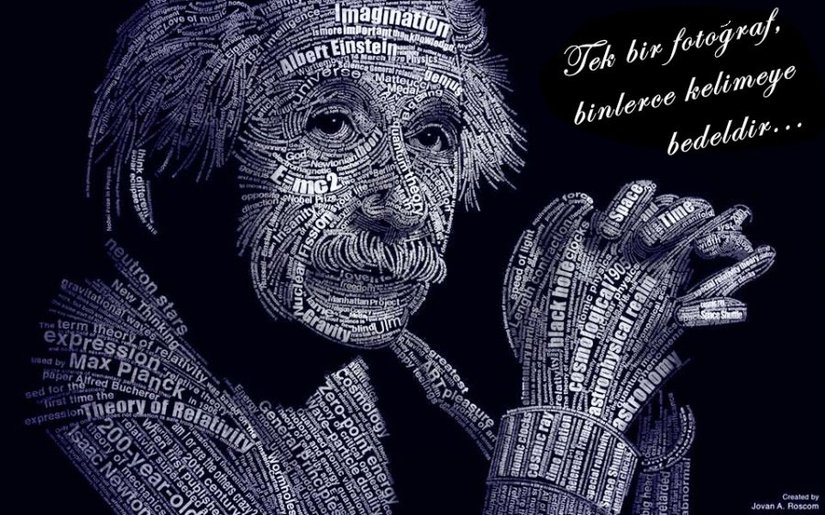 Albert Einstein'ın insanlığa kattıklarını ve ömrü boyunca yaptığı araştırmaları anlatmak için ayrı bir site kurmamız bile gerekebilirdi. Sadece geliştirdiği Görelilik Teorisi'nin bizlere gösterdikleri bile, cilt cilt kitap olabilecek kadar kapsamlıdır. Ancak Jovan Roscom tarafından hazırlanan bu hoş görselde, Einstein'ın keşfettikleri, araştırmaları ve bulguları, onun meşhur bir fotoğrafını oluşturacak şekilde yerleştirilmiştir. Hayatı boyunca yaptıklarının, Einstein ile ilişkilendirilen bazı konu başlıklarının ve fotoğrafta yazanların en azından bir kısmını listeleyecek olursak: