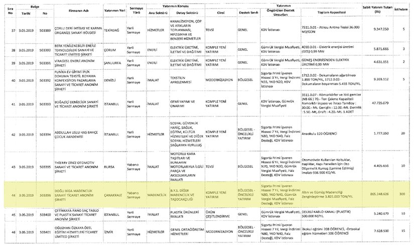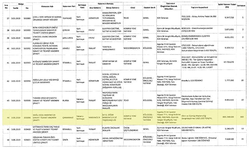Resmi GazeteKıyas olması bakımından, Türkiye'nin gayrı safi yıllık hasılası ise 2018'de 766 milyar dolardı; sadece Çanakkale'nin sadece 2009 yılındaki yıllık tarım hasılası 1.3 milyar dolar kadardır. Firmanın Çanakkale'de yaratacağı toplam istihdam 300 kişidir. Buna karşılık aynı Resmi Gazete sayısında 74 milyon TL teşvik alan Denizli'deki bir tekstil firması 307 kişilik istihdam yaratacaktır. Buna değer mi?