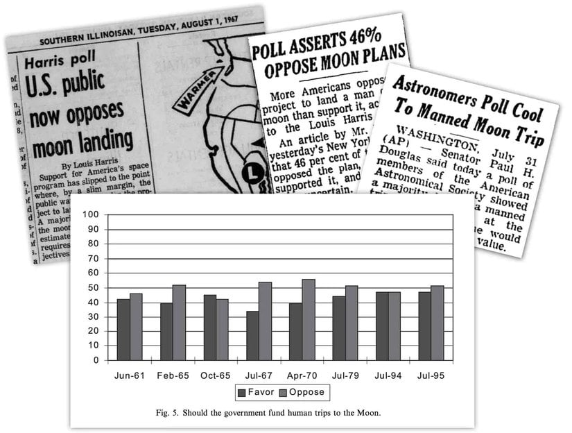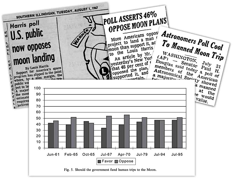 Eğer geriye dönüp NASA'nın Apollo Ay görevlerinin halk arasında gördüğü desteğin zaman içinde değişimini düşünecek olursanız, sanki halkın bu görevleri her zaman can-ı gönülden desteklediği yanılgısına düşebilirsiniz. Halbuki NASA Ay'a gidene kadar (hatta gittikten sonra bile) halkın bu görevlere desteği inanılmaz düşük seviyelerdeydi: 1961 yılında Gallup tarafından yapılan bir ankete göre, John F. Kennedy bu projeyi gümbür gümbür bir konuşma ilan ettiğinde Amerikan halkının sadece %33'ü Ay görevlerini destekliyordu.[1] Kıyas olması bakımından, ABD Başkanı Kennedy'nin halk arasındaki destek oranları 1961 boyunca %75 civarındaydı.[2]