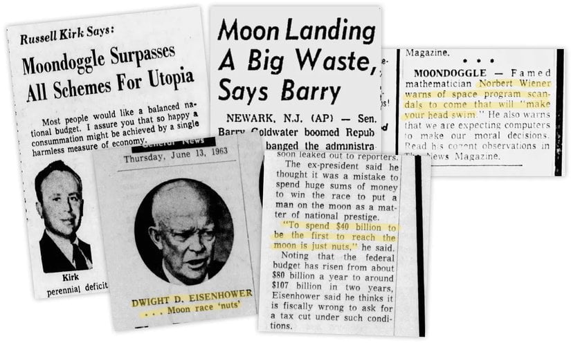 Ünlü muhafazakar (ve "mâli şahin") Barry Goldwater, Ay keşiflerinin yüce hedeflerini "savurgan bir çaba" olarak reddetmişti; hoş, bu eleştirilerini, her katılımcının 100 dolar (2023 itibariyle 1000 dolara yakın) ödediği gösterişli bir akşam yemeğinde dile getirdiği göz önüne alınacak olursa, bunun ne kadar ironik bir eleştiri olduğu anlaşılabilir. Aynı yıl Goldwater, Amerika Birleşik Devletleri'ni "Ay sevicilikle" suçladı. Başkan Kennedy'nin daha önceden Ay'a ulaşmak için Sovyetler Birliği ile işbirliği yapma önerisine de Cumhuriyetçiler karşı çıkmıştı. Başkanlığı sırasında NASA'yı kuran Dwight Eisenhower, "Sırf prestij amacıyla girilen bu Ay yarışında 40 milyar dolar harcamak çılgınlık!" diyordu. Diğer Cumhuriyetçiler de Kennedy'nin bu hayaline "Moondoggle" lakabını takmıştı. Bu terim, ilk olarak 1961 yılında, aslen sol görüşleriyle bilinen yapay zeka öncüsü (ve yapay zekaya yönelik felaket tellâllığının başını tarihte ilk çeken kişi olan ) Norbert Wiener tarafından ortaya atılmıştı.[4]
