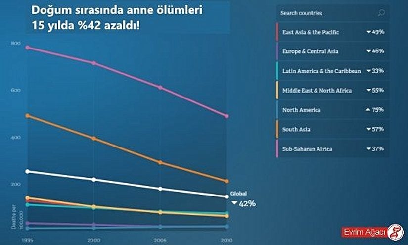 Grafikte gösterildiği üzere, 1995 yılından bu yana doğum sırasında meydana gelen sorunlar nedeniyle ölen kadınların sayısı Afrika'da her 100.000 doğumda 781 ölümden 489 ölüme inmiştir. Aynı sayı, en büyük sorunların yaşandığı ikinci bölge olan Güney Asya'da 491'den 212'ye düşmüştür. Diğer coğrafi bölgelerde de benzer şekilde azalmalar görülmektedir. Tüm bu azalmaların ortalama etkisi, küresel ölçekte bakıldığında son 15 yılda %42'lik bir azalmaya denk gelmektedir!