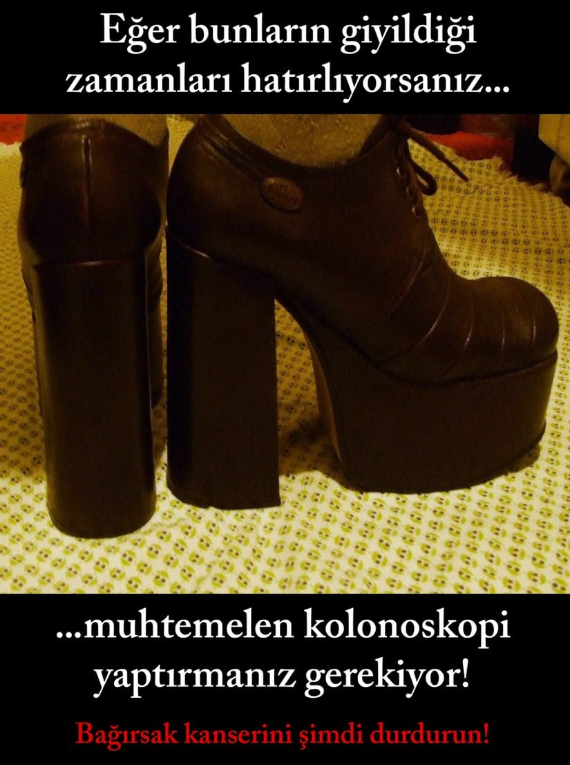 Afişin asıl vurgusu ise, elbette yaş içindir: Her yıl yeni bağırsak kanseri vakalarının %90'ı, bağırsak kanseri nedeniyle ölümlerinse %95'i, 50 yaş ve üzeri kişilerde görülmektedir (genç okurlarımız için, bu afişteki ayakkabılar özellikle 60 ve 70'li yıllarda modaydı).
