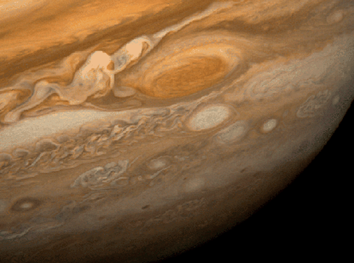 Today's Picture: June 25, 1995 Jupiter from Voyager Picture Credit: NASA, JPL, NSSDC, Voyager Explanation: Imagine a hurricane that lasted for 300 years! This picture of the planet Jupiter was taken by the Voyager 1 spacecraft as it passed the planet in 1979. Jupiter, a gas giant planet with no solid surface, is the largest planet in the solar system and is made mostly of the hydrogen and helium. Clearly visible in the photo is the Great Red Spot, a giant, hurricane-like storm system that rotates with the clouds of Jupiter. It is so large three complete Earths could fit inside it. Astronomers have observed this giant storm on Jupiter for over 300 years. For more information see NASA Jet Propulsion Laboratory release. We keep an archive of previous Astronomy Pictures of the Day. Astronomy Picture of the Day is brought to you by Robert Nemiroff and Jerry Bonnell . Original material on this page is copyrighted to Robert J. Nemiroff and Jerry T. Bonnell.