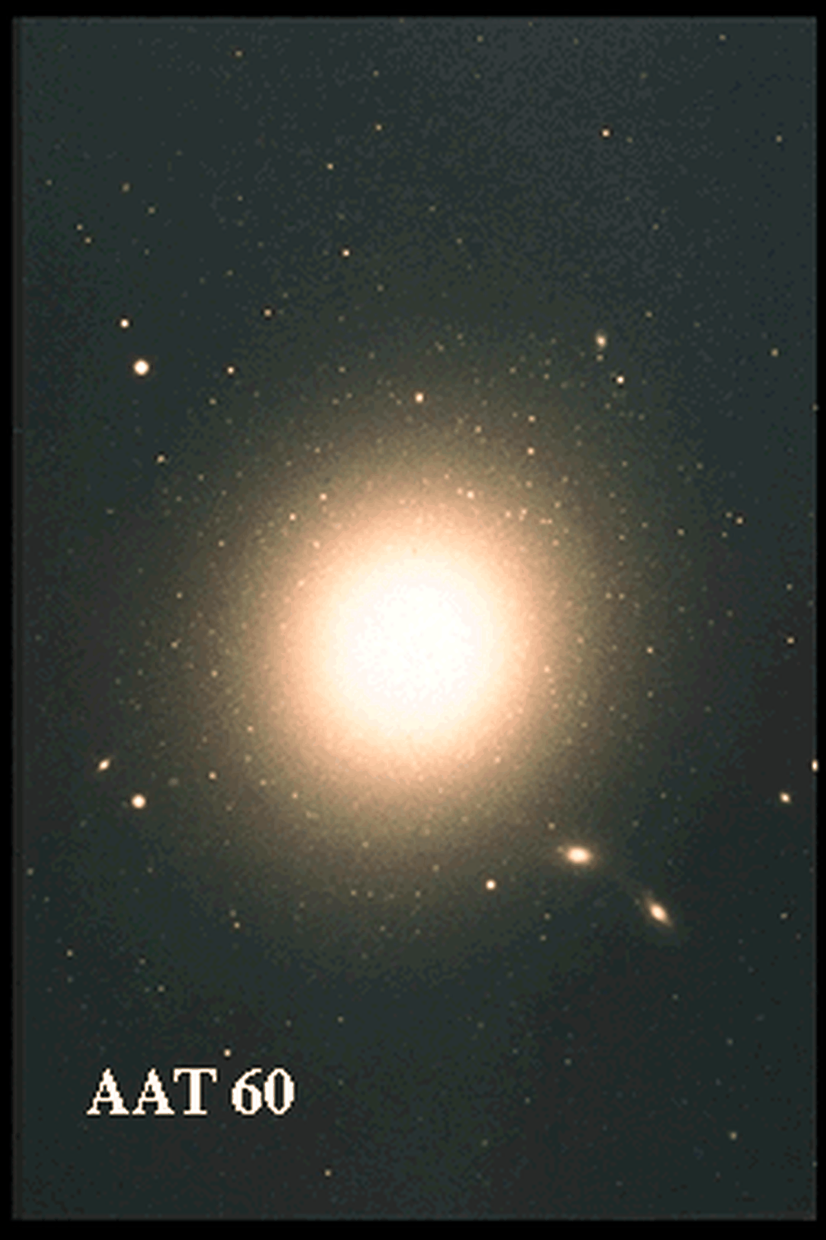cal galaxy M87 is a type of galaxy that looks much different than our own Milky Way Galaxy. But even for an elliptical galaxy M87 is peculiar. M87 is much bigger than an average galaxy, appears at the center of a whole cluster of galaxies known as the Virgo Cluster, and shows a very high number of globular clusters. These globular clusters are visible as faint spots surrounding the bright center of M87. In general, elliptical galaxies contain similar numbers of stars as spiral galaxies, but are ellipsoidal in shape (spirals are mostly flat), have no spiral structure, and little gas and dust. This picture is number sixty on a publicly posted list of images from the Anglo-Australian Telescope (AAT).