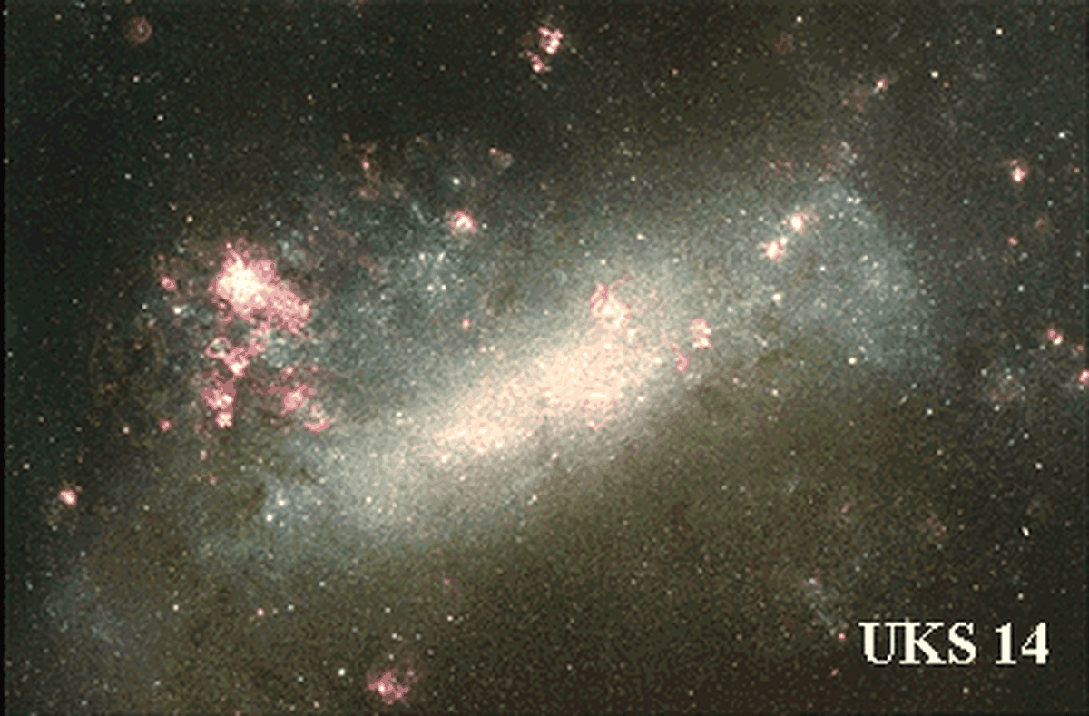 Almost every object in the above photograph is a galaxy. The Coma Cluster of galaxies pictured is a dense cluster containing many thousands of galaxies. Many of these galaxies contain as many stars as our own Milky Way Galaxy. Although nearby when compared to most other clusters, light from the Coma Cluster still takes hundreds of millions of years to reach us. In fact, the Coma Cluster is so big it takes light millions of years just to go from one side to the other! This picture was created at the WWW site Skyview, a "virtual observatory" where it is possible to view any part of the sky in wavelengths from radio to gamma-ray.