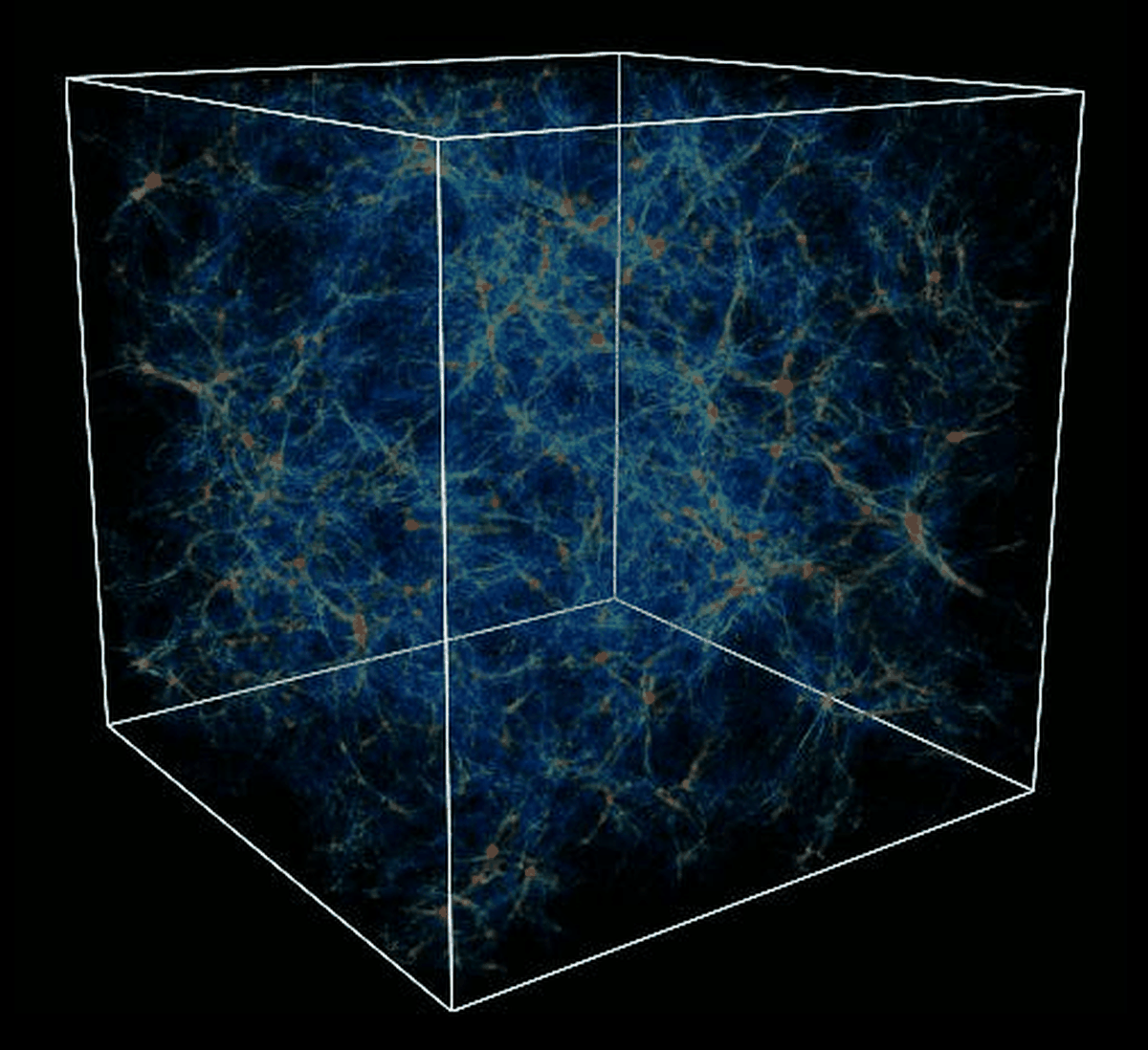 The above cube represents a chunk of our universe as simulated by the Grand Challenge Cosmology Consortium (GC3). The cube is huge - it would take light 500 million years to cross it. Low density gas is shown as blue, and high density gas as red. In the beginning of the