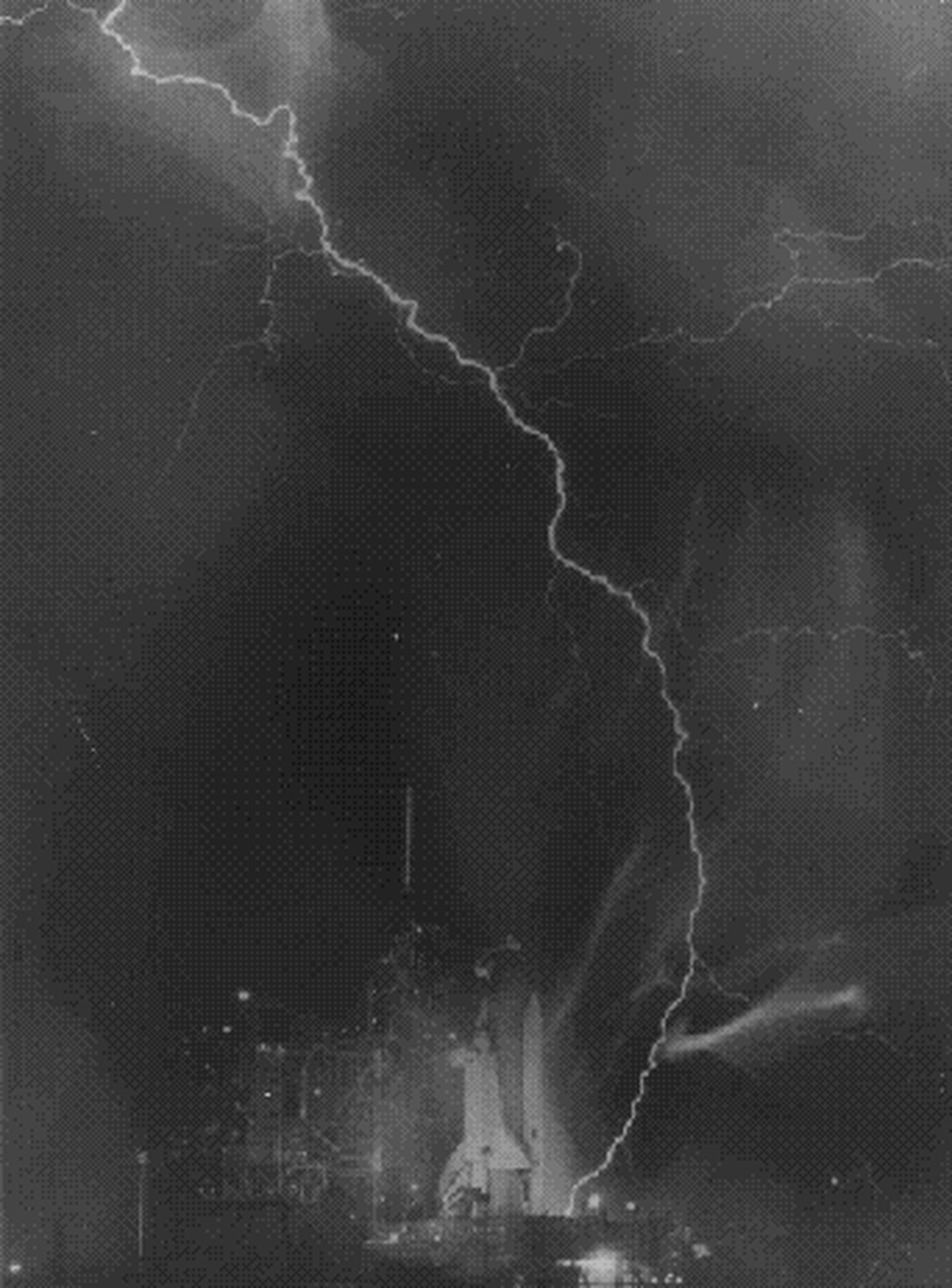 There are many things about lightning that are not understood. Lightning has been seen in the atmospheres of Venus, Earth, Jupiter, and Saturn. A leading theory is that collisions of particles in clouds cause large areas of positive and negative charge. When large oppositely charged areas get close enough together, electrons and/or ions race between them and create a path where more charged particles can follow - lightning. On average, over 100 lightning strikes occur every second over the surface of the Earth. Here lightning strikes near a Space Shuttle before launch. Lightning can be extremely dangerous - stay out of open areas during thunderstorms.