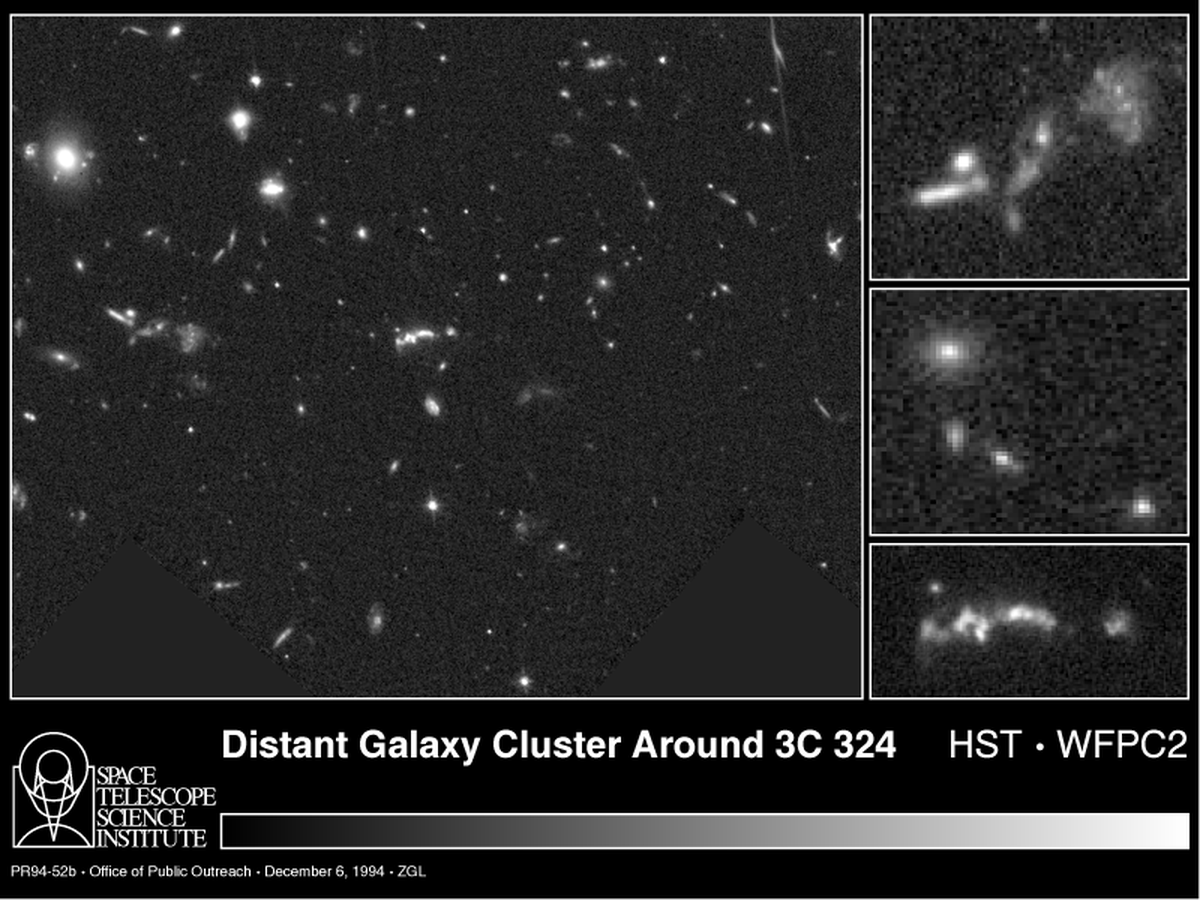 What did the universe look like near the beginning? This exciting photo by the Hubble Space Telescope is one of the deepest ever taken, and shows galaxies as far away as ever before photographed. The universe back then - when only one third of its present age - was a strange and violent place. Back then a large fraction of galaxies were colliding and interacting. In fact, the shapes of many galaxies in the above photo are more distorted than most nearby galaxies. At this early universe epoch many clusters of galaxies were just forming. The bright twisted group of galaxies below the photographs center contains the energetic radio galaxy 3C324.