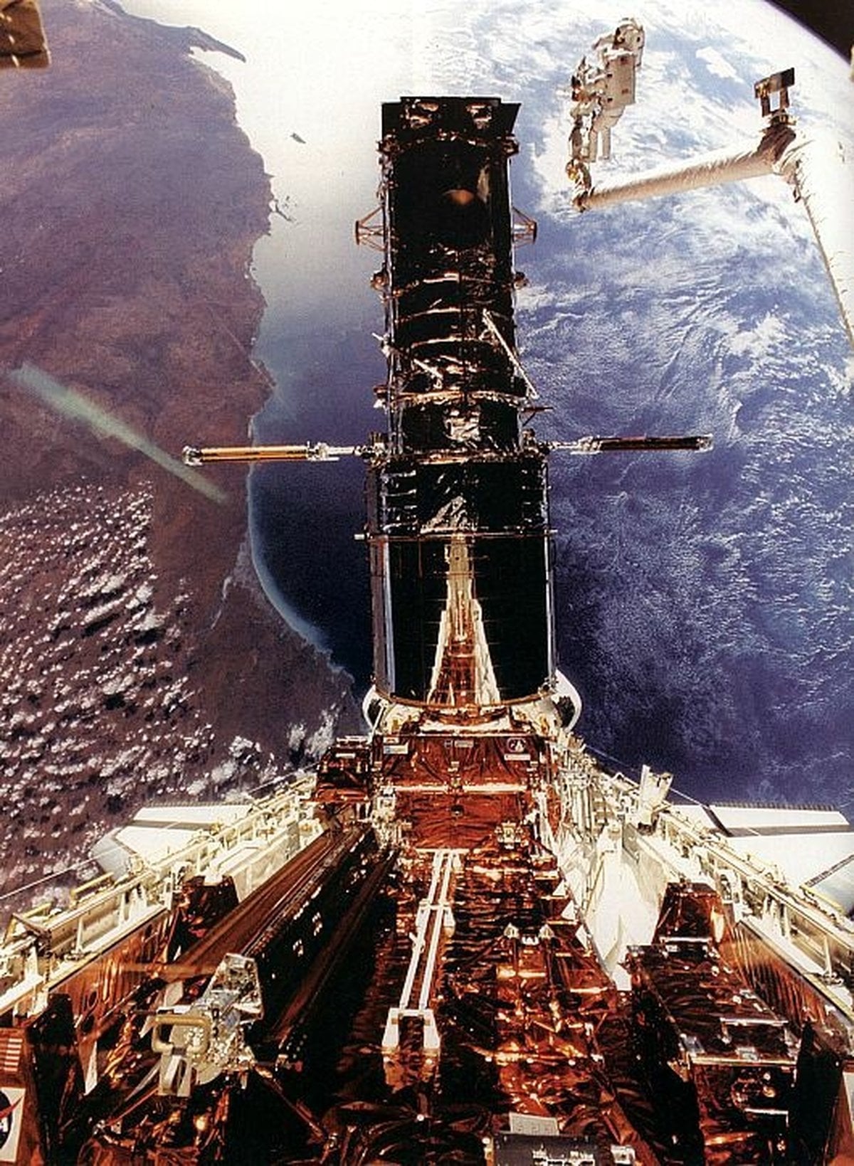In December of 1993 astronauts Story Musgrave and Jeffrey Hoffman performed the orbiting repairmans' ballet 400 miles above the Earth. They are seen in this photo perched at the end of the Space Shuttle Endeavour's robotic arm making final repairs to the four story tall Hubble Space Telescope. The coast line of western Australia is visible below. The complex and highly successful repair mission allowed HST to see into the Universe with unprecedented clarity.