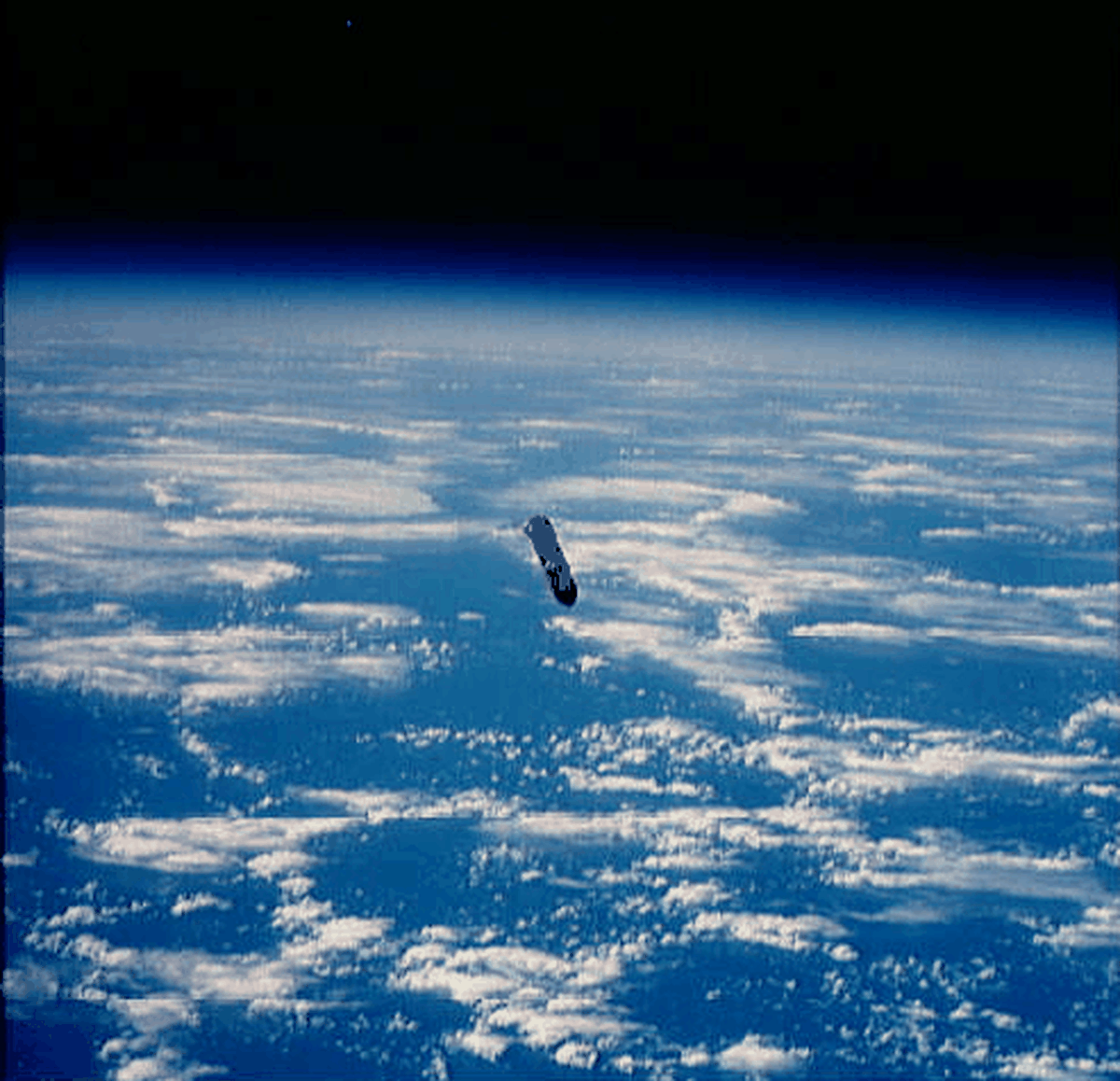 Sixteen minutes after the liftoff of STS-29, the Space Shuttle Discovery's jettisoned External Tank (ET) is seen here, in a photograph by shuttle astronaut James P. Bagian, falling back towards Earth. The 154 foot long ET is the largest non-reusable component in the Shuttle system. After carrying over 500,000 gallons of liquid propellant to feed the shuttle's main engines during liftoff, its ultimate fate is to re-enter the atmosphere, break up and descend into a remote ocean area. The side of this ET shows a normal burn scar caused during the separation of one of the reusable solid rocket boosters.