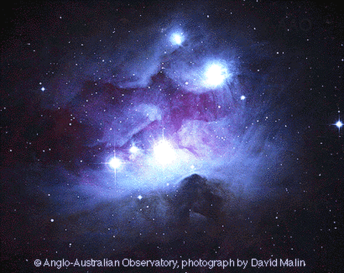 The Orion Nebula is visible to the unaided eye as a fuzzy patch near the famous belt of three stars in the constellation Orion. The above picture captures a part of the Orion Nebula that primarily reflects light from bright Orion stars. This reflection nebula appears blue because the blue light from the neighboring stars scatters more efficiently from nebula gas than does red light. The dark lanes are composed of mostly interstellar dust - fine needle-shaped carbon grains.