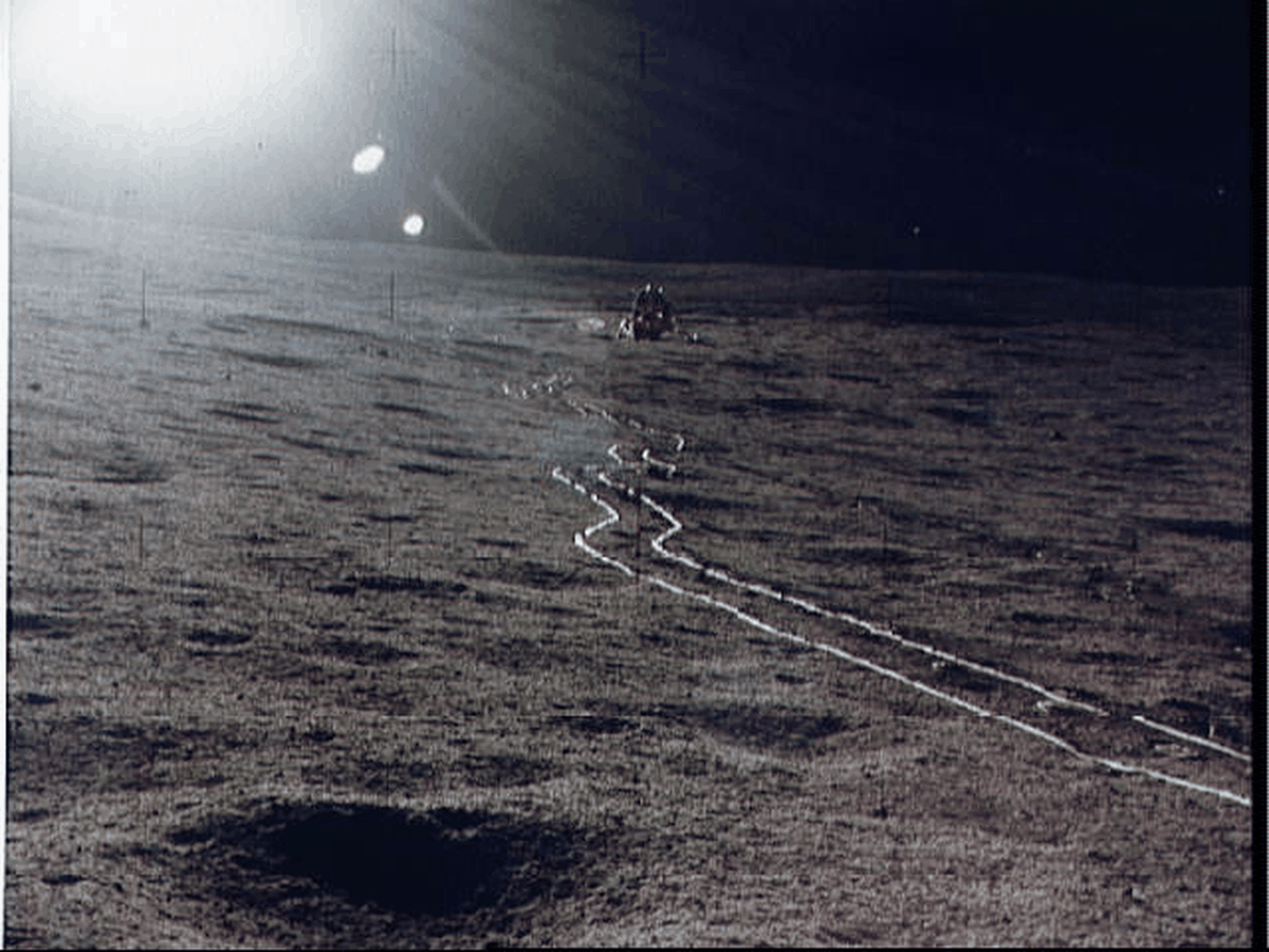 Brilliant sunlight glints off tracks gently winding across the the Moon's Frau Maro highlands. The tracks were made by the Apollo 14 crew's two-wheeled Modularized Equipment Transporter (MET), fondly known as the "rickshaw". The MET was designed as an aid to surface exploration. Serving as a workbench with a place for the lunar handtools, it also carried cameras, sample containers, spare film and a Lunar Surface Penetrometer. The path outlined in the lunar soil leads away from Alan Shepard and Edgar Mitchell's Lunar landing Module, tracing the path of their first venture across the lunar landscape.