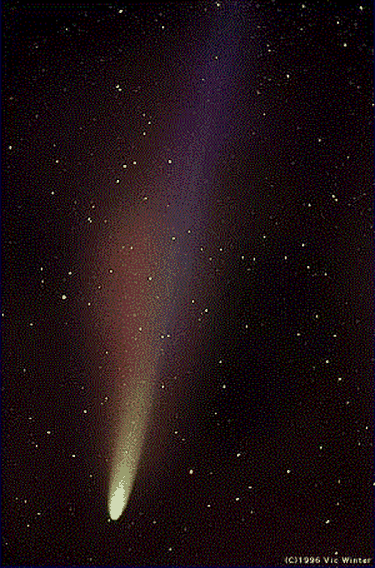 Comet Hyakutake is shown photographed the night of March 27 in Arizona, USA, with a cactus in the foreground. Polaris, the north star, is the bright star seen just to the upper right of the comet's head. Today Comet Hyakutake reaches its closest approach to the Sun. Comet Hyakutake is now at its intrinsic brightest, but because of its distance from the Earth, it will appear less bright to us than it did during its closest approach to the Earth in late March. In fact, due to the comet's angular proximity to the Sun, it will difficult to see at all from the Earth! Comet Hyakutake will reach less than one quarter of the Earth-Sun distance - inside the orbit of Mercury. Comet Hyakutake will not venture near the Sun again for another about 15,000 years.