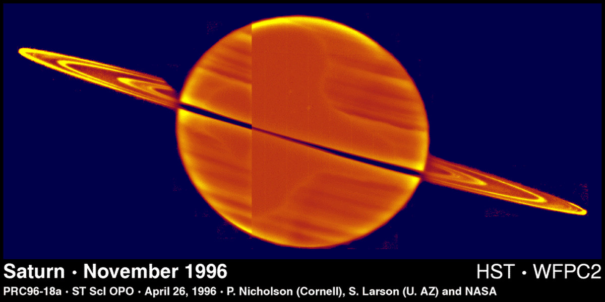 These five pairs of Hubble Space Telescope images track some of Saturn's moons as they orbit the ringed planet. A pair of images was taken every 97 minutes on November 21, 1995 with the Wide Field Planetary Camera-2, the normally bright ring system appearing nearly edge-on. In the top pair, the large bright moon Dione hangs above center while the smaller moons Pandora, Prometheus, and Mimas (top right image) appear near the planet's disk close to the outer ring. By the second and third pair of images, moons Rhea and Epimetheus have joined the dance. During the Saturn ring plane crossings, the reduction in light from the edge-on rings provided an opportunity for astronomer's to explore Saturn's complex moon system and search for elusive undiscovered satellites.