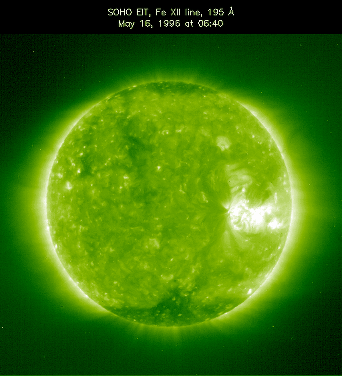 The ultraviolet light emitted by eleven times ionized iron at temperatures over 2 million degrees Farenheit was used to record the above picture of the Sun on May 16. The image was made by the EIT camera onboard the SOHO spacecraft, a space observatory which can continuously observe the Sun. Eleven times ionized iron is atomic iron with eleven of its electrons stripped away. Here the electrons are stripped by the frantic collisions with other atoms and electrons which occur at the extreme temperatures in the Solar Corona. Since electrons are negatively charged, the resulting ionized iron atom is highly positively charged. Astronomer's "shorthand" for eleven times ionized iron is written "Fe XII", the chemical symbol for iron followed by a Roman numeral 12 (Fe I is neutral iron).