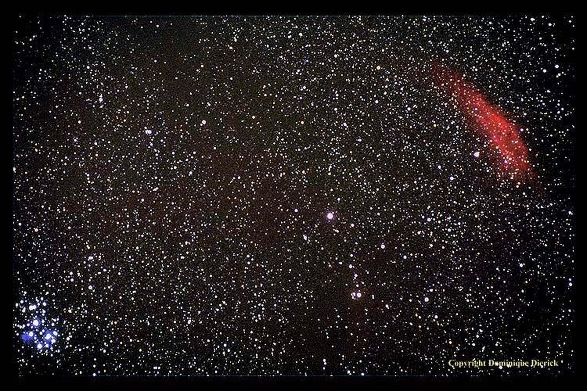 In the lower left corner, dressed in blue, is the Pleiades. Also known as the Seven Sisters and M45, the Pleiades is one of the brightest and most easily visible open clusters on the sky. The Pleiades contains over 3000 stars, is about 400 light years away, and only 13 light years across. Surrounding the stars is a spectacular blue reflection nebula made of fine dust. A common legend is that one of the brighter stars faded since the cluster was named. In the upper right corner, dressed in red, the California Nebula. Named for its shape, the California Nebula is much dimmer and hence harder to see than the Pleiades. Also known as NGC 1499, this mass of red glowing hydrogen gas is about 1500 light years away.