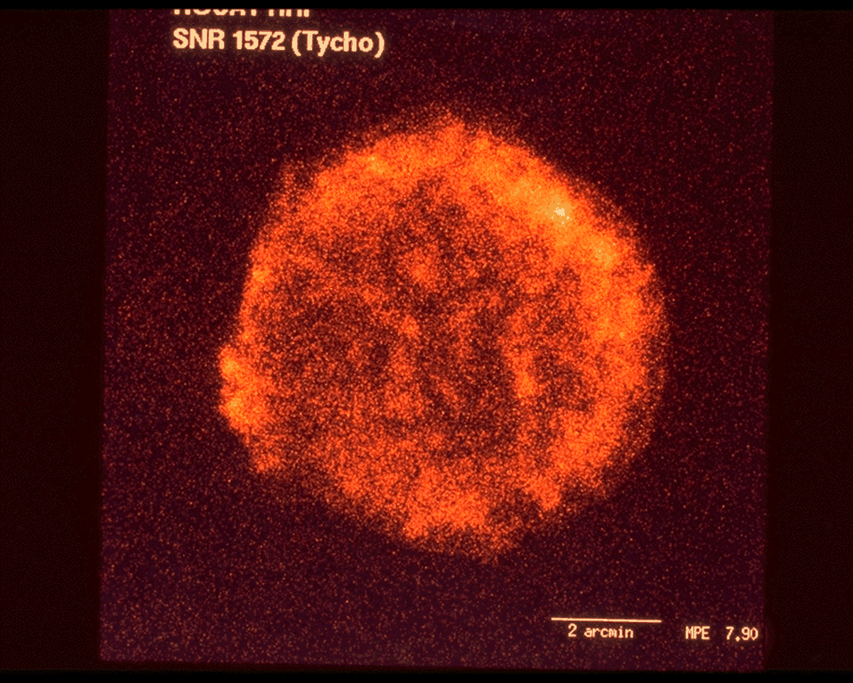 How often do stars explode? By looking at external galaxies, astronomers can guess that these events, known as a supernovae, should occur about once every 30 years in a typical spiral galaxy like our MilkyWay. However, the obscuring gas and dust in the disk of our galaxy probably prevents us from seeing many galactic supernovae -- making observations of these events in our own galaxy relatively rare. In fact, in 1572, the revered Danish astronomer, Tycho Brahe, witnessed one of the last to be seen. The remnant of this explosion is still visible today as the shockwave it generated continues to expand into the gas and dust between the stars. Above is an image of the X-rays emitted by this shockwave made by a telescope onboard the ROSAT spacecraft. The nebula is known as Tycho's Supernova Remnant.