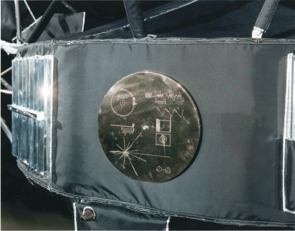 Launched in the early 1970s Pioneer 10 and 11 were appropriately named - becoming the first spacecraft to travel through the asteroid belt, first to fly by Jupiter and Saturn, and the first human artifacts to venture beyond the solar system. Now coasting through interstellar space, they carry with them greetings in the form of a gold anodized plaque with symbolic drawings as illustrated above. The male and female figures are drawn to the same scale as the Pioneer spacecraft shown behind them. Immediately to the left is a map of the position of the sun with respect to nearby pulsars and the center of the galaxy while below is a drawing of the solar system indicating the planet of origin. In the upper left is a schematic of two fundamental states of the hydrogen atom. These diagrams along with other details of the plaque were designed by Carl Sagan of Cornell University and are intended to be decipherable by spacefaring extraterrestrial civilizations.
