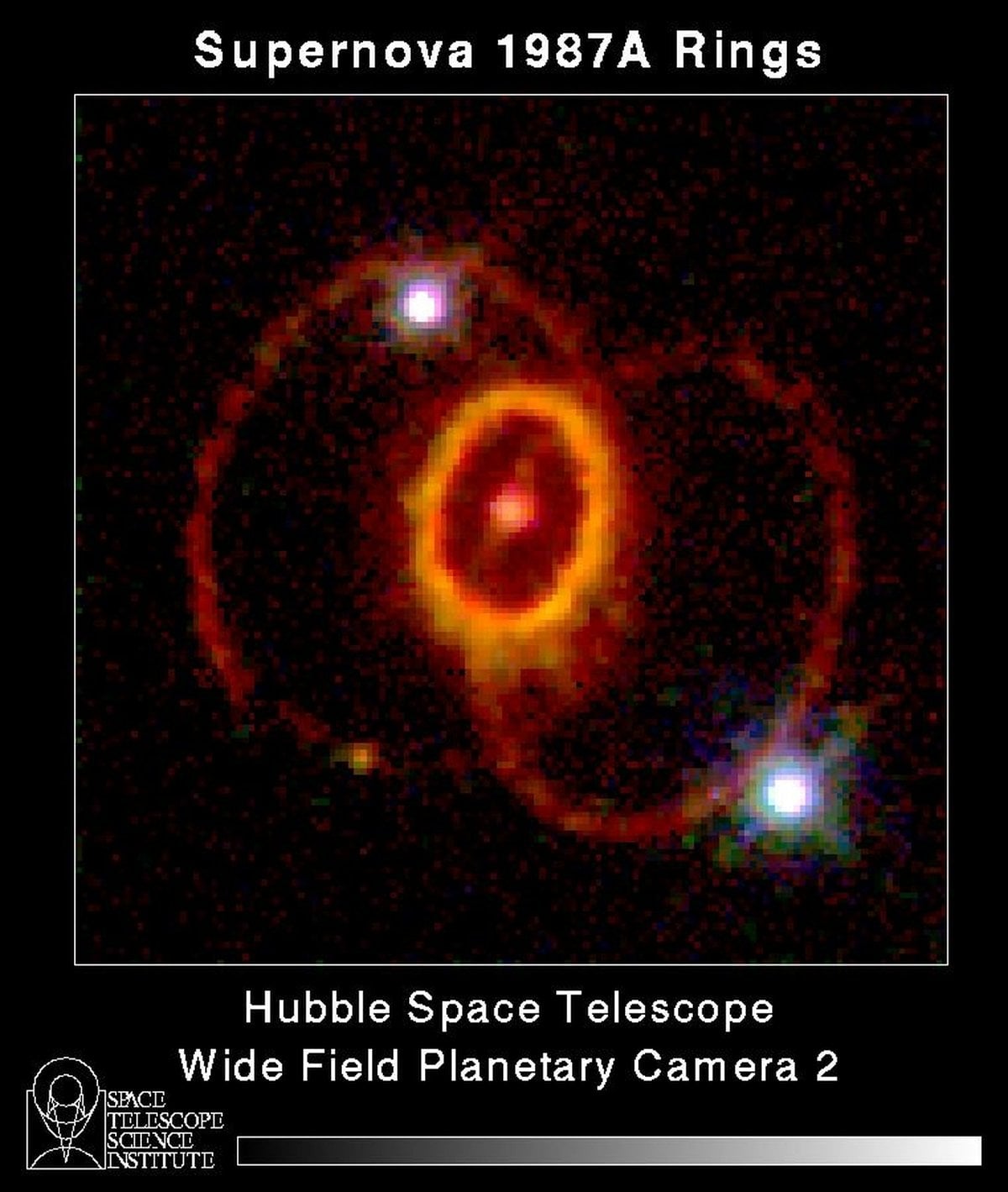 What's causing those odd rings in supernova 1987a? In 1987, the brightest supernova in recent history occurred in the Large Magellanic Clouds. At the center of the picture is an object central to the remains of the violent stellar explosion. When the Hubble Space Telescope was pointed at the supernova remnant in 1994, however, curious rings were discovered. The origins of these rings still remains a mystery. Speculation into the cause of the rings includes beamed jets emanating from a dense star left over from the supernova, and a superposition of two stellar winds ionized by the supernova explosion.