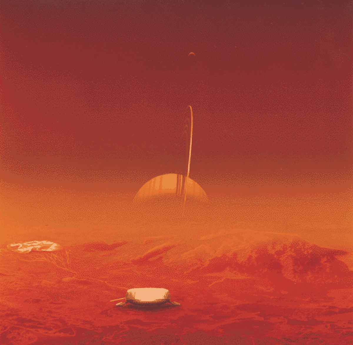 The above artistic portrait of Saturn depicts how it might look from Titan, Saturn's largest moon. In the foreground sits ESA's Huygens probe, which will be released by NASA's Cassini spacecraft. The Cassini mission to Saturn in currently planned for launch in late 1997. Cassini will reach Saturn in 2004 and will release the Huygens probe later that year. Titan is one of only two moons in the Solar System to have an atmosphere, It has been suggested Titan might have gasoline-like lakes, and may even harbor life.