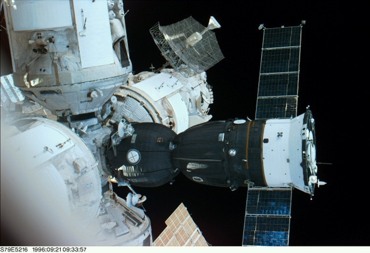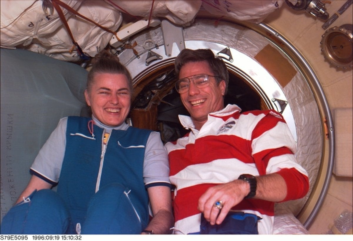 Explanation: Today is Shannon Lucid's first day on Planet Earth in six months. Her stay aboard Russia's Mir Space Station was of record length - the longest stay of any American in space ever. During her time in orbit around the Earth, Lucid, a biochemist, did many things including experiments on the effect of weightlessness on the human body. Pictured above, Lucid greets the astronaut that will replace her on Mir, John Blaha.