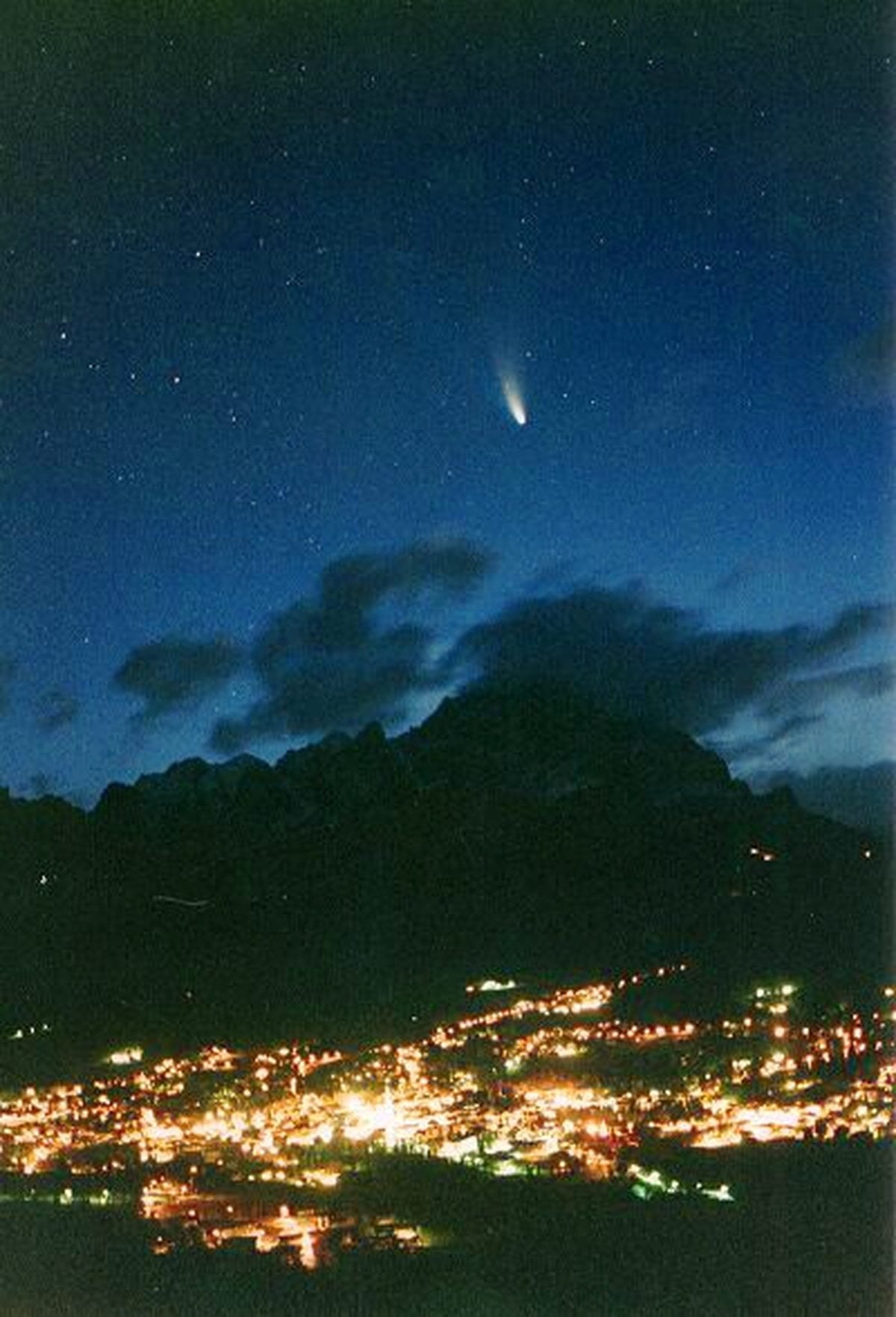 Explanation: Moonlight illuminates the landscape and lends a painterly quality to this beautiful photograph of the Absaroka mountain range, located along the Montana-Wyoming border near the USA's Yellowstone National Park. In the foreground lies the North Fork of the Shoshone River. The snow-covered peak rising 10,500 feet on the left is Jim Mountain, while Comet Hale-Bopp graces the western sky. Inspired by painters of the American West, like Fredric Remington, Charles Russell, and George "Dee" Smith, photographer Dewey Vanderhoff of Cody, Wyoming has taken advantage of the double blessings of a bright Moon and a bright comet to produce this breathtaking image.