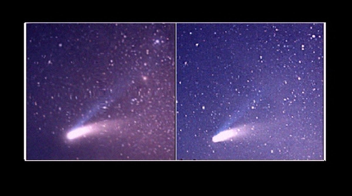 Explanation: Does a comet's dust tail always orbit behind it? Since comets rotate, they shed gas and dust in all directions equally. Small ice and dust particles expelled by the comet, however, are literally pushed around by sunlight. The smaller the particle, the greater the effect. When the comet is headed inward, sunlight slows down small particles so they orbit behind the comet. When the comet is headed back out though, sunlight speeds them up, so small particles orbit in front of the comet. Comet Hale-Bopp itself is too big to have its orbit affected by the momentum of sunlight. Therefore, since Comet Hale-Bopp started back out to the outer Solar System two days ago, we can expect the dramatic dust tail shown above to shift in front in the coming days.