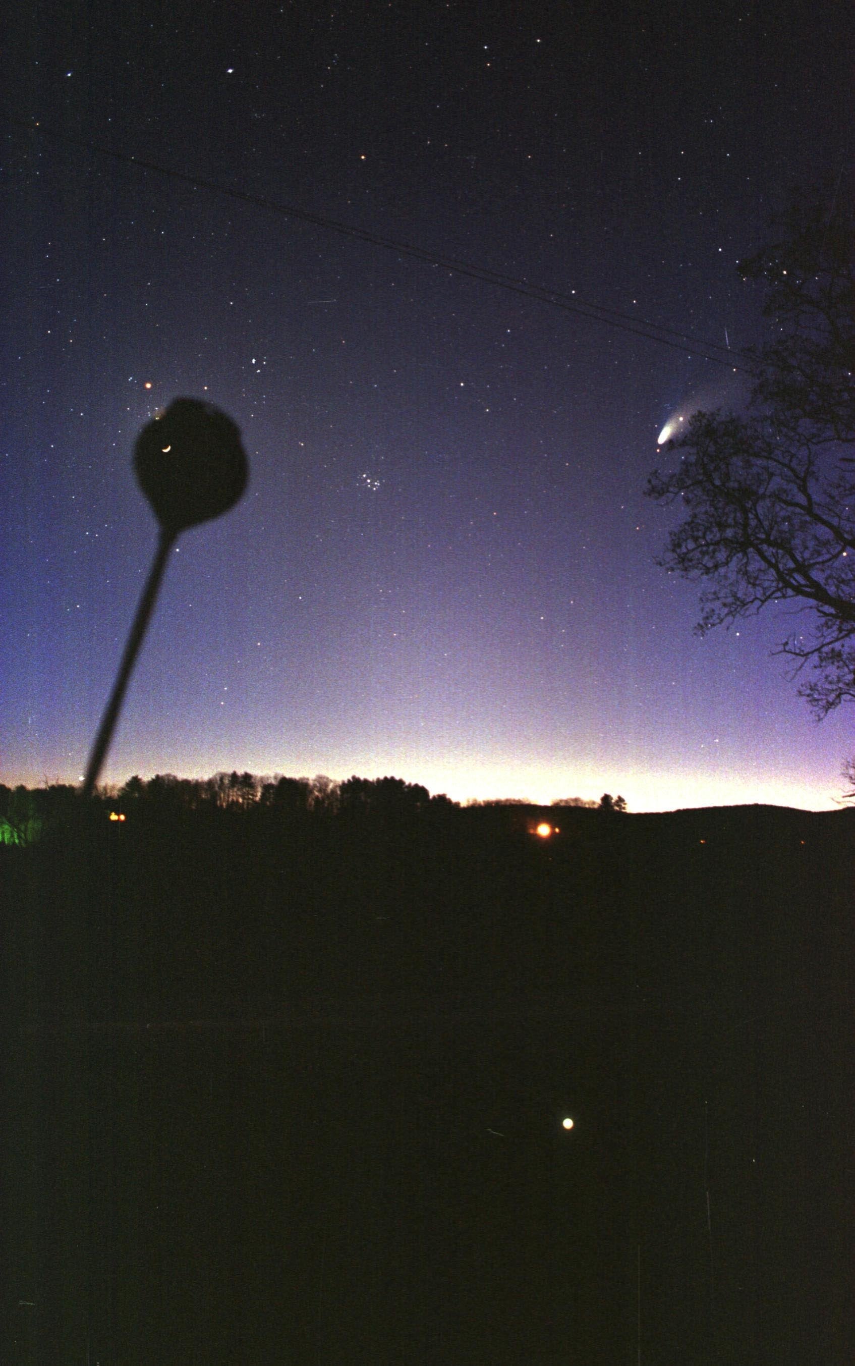 Where is Mars Pathfinder? Follow the arrow in the above picture taken by the Viking Orbiter in 1976. From the surface Mars appears covered with rocks, but from orbit Mars appears covered with craters. However, several familiar features are visible in this photograph. To the left (west) of Sagan Memorial Station are the now-familiar twin peaks that dominate the horizon of many Pathfinder photographs. These hills are about one kilometer from the landing site, twice the planned range of Sojourner. Two craters loom nearby: a small one to the east not easily visible here, and a big one to the south of Pathfinder. The landing site is in the dry flood channel named Ares Vallis.