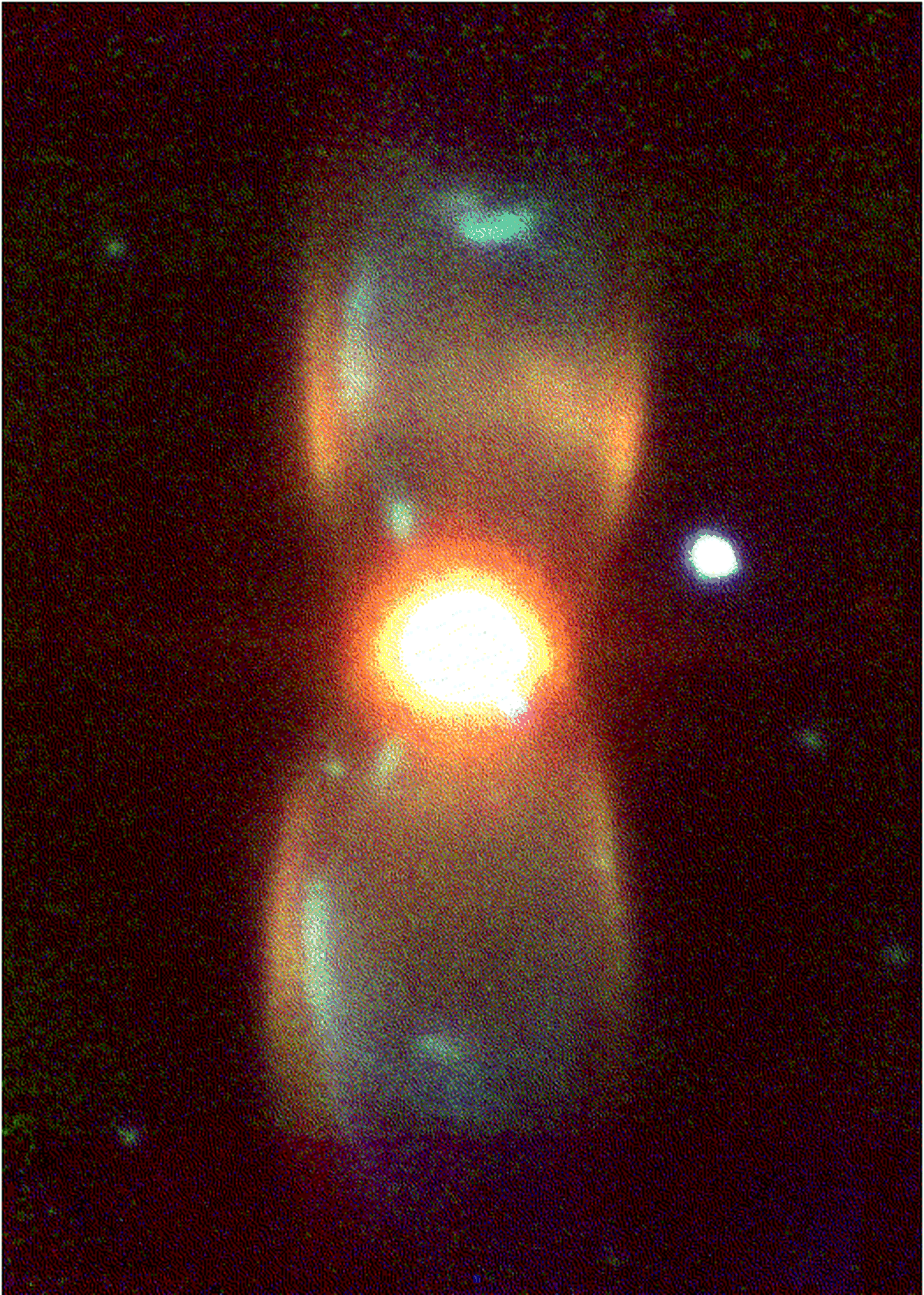 Yerden yapılan teleskop gözlemi (solda), NGC4038 ve NGC4039 gökadalarının çarpışmasını gösteriyor. Bu kozmik kazanın yaşandığı bölgeden savrulan parlak maddeler, böcek antenlerini andıran uzun, yay biçimli “antenler” oluşturmuş. Hubble Uzay Teleskobu’nu kullanan araştırmacılar, iki gökada çekirdeğinin yakınındaki kozmik enkazı incelerken yakın zamanda binden fazla parlak, genç yıldız kümesi keşfettiklerini duyurdu. Bunlar, çarpışmanın tetiklediği bir yıldız oluşumu patlamasının ürünü. Yeşil kontur, daha yüksek çözünürlüklü Hubble görüntüsünün (sağda) kapsadığı alanı gösteriyor. Anten galaksilerinin uzaklığında (yaklaşık 63 milyon ışık yılı), bu görüntüdeki bir piksel yaklaşık 15 ışık yılına karşılık geliyor. İki galaktik çekirdeğin çevresindeki toz bulutları, onların daha sönük ve daha kızıl görünmesine yol açarken; yeni oluşan kümelerdeki büyük kütleli, sıcak, genç yıldızlar mavi görünüyor. Peki çarpışan gökadalar zamanla nasıl evrimleşir? Gökada çarpışmalarında oluşan yıldız kümelerinin yaşlarını belirlemek, önemli ipuçları sağlayabilir. Anten galaksileri, güney gökküresindeki Corvus takımyıldızı yönünde görülür.