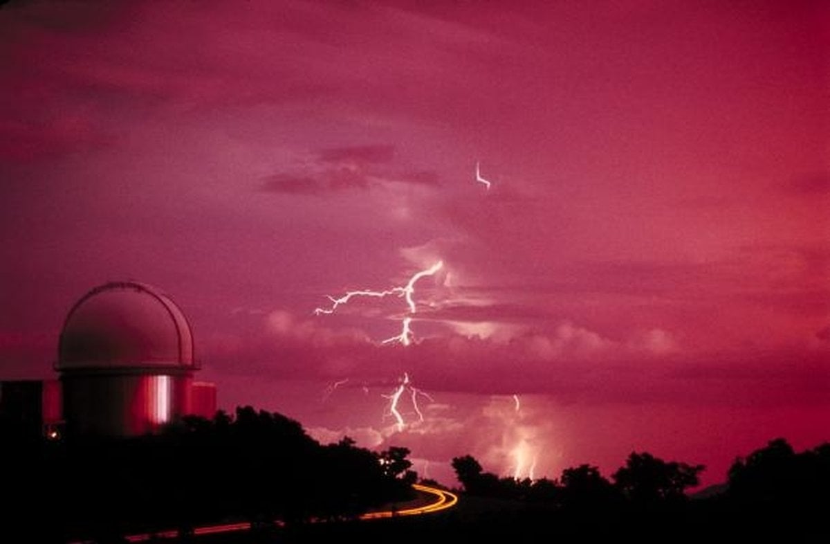 At the top of Kitt Peak Mountain near Tucson, Arizona lies one of the world's great collections of telescopes. As pictured, in the dome at the far left lies the 3.5-meter WIYN Telescope, famous recently for tracking distant supernovae. The next major dome to the right houses a 36-inch telescope now used mostly for imaging. Farther to the right beside a thin tower is a 2.1-meter Telescope used currently for imaging and spectroscopy. The unusual triangular building houses the McMath-Pierce Solar Telescope. In front of it lies the Vacuum Tower Telescope while in back are the Burrell-Schmidt Telescope and the SARA 0.9-meter automated telescope. At the far right lies one of the world's largest telescopes: the 4-meter Mayall Reflector. Kitt Peak recently celebrated its 40th year during which it helped establish the existence of dark matter and the first gravitational lens. Kitt Peak National Observatory is part of the United States' National Optical Astronomical Observatories and is operated under agreement with the National Science Foundation.