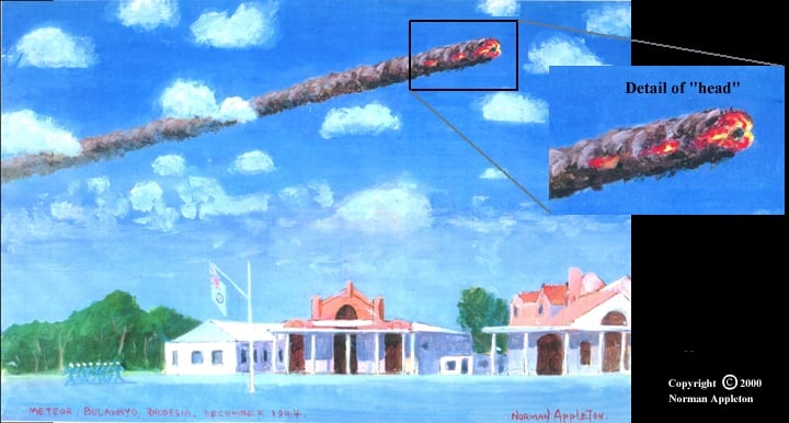 While stationed in central Africa in December 1944, Norman Appleton witnessed a meteor so bright he remembered it his entire life. Right before his eyes a tremendous smoking fireball streaked across the daytime sky. Years later, as an accomplished member of the Guild of Aviation Artists, he recorded his memories in the above painting. Tonight and tomorrow mark the peak of this year's Leonid meteor shower. Although any individual observer is unlikely to see a fireball as spectacular as this one, observers in dark locations might witness as many as hundreds of transient streaks of light emanating from the constellation of Leo across a morning moonlit sky.