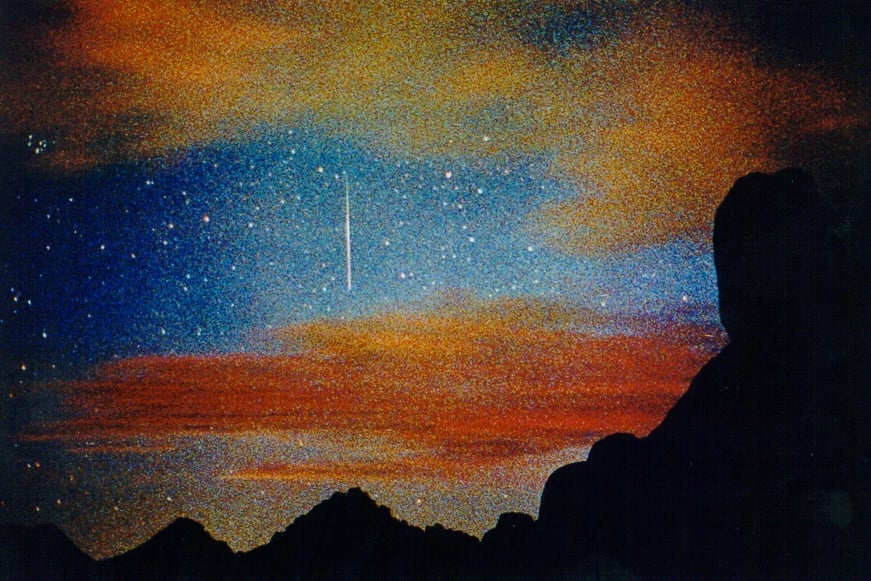 Such beautiful things begin as grains of sand. Locked in an oyster a granule grows into an iridescent pearl, lustrous and lovely to behold. While hurtling through the atmosphere at 70 kilometers per second, a cosmic sand grain becomes an awe-inspiring meteor, its transient beauty displayed for any who care to watch. Framed perfectly between orange clouds at sunrise, this bright meteor trail was photographed from the Joshua Tree National Park in California, USA during the 1998 Leonid Meteor Shower. Appropriately titled "Leonid Sunrise", the picture was recorded on high-speed film (ASA 3200) with a 35mm camera. Its striking colors and grainy, textured appearance suggest a painting on canvas. Of course, you could see Leonid meteors at sunrise for yourself. With clear skies, your next chance is coming up ... tomorrow morning.