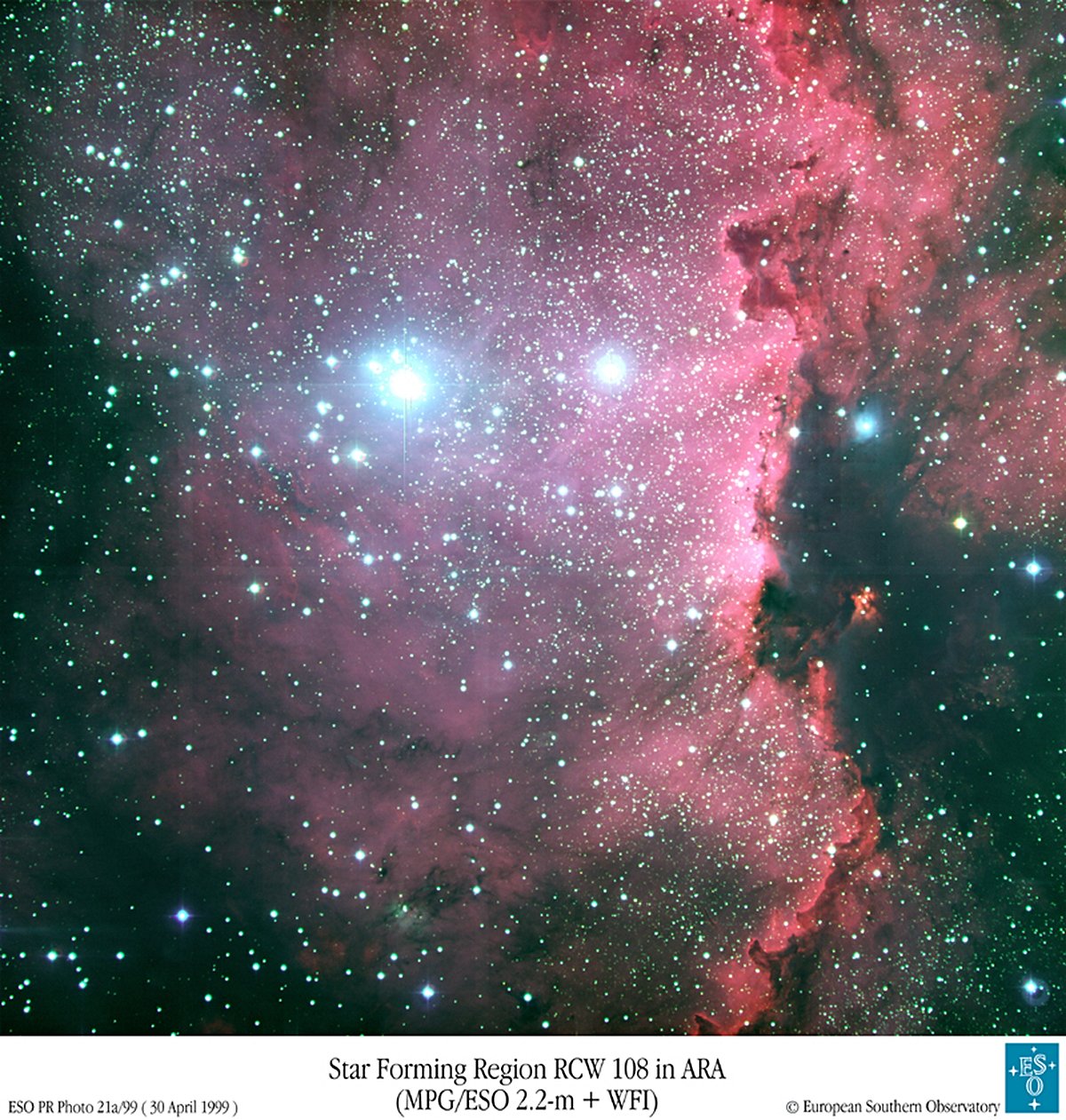 Hot blue stars, red glowing hydrogen gas, and dark, obscuring dust clouds are strewn through this dramatic region of the Milky Way in the southern constellation of Ara (the Altar). About 4,000 light-years from Earth, the stars at the left are young, massive, and energetic. Their intense ultraviolet radiation is eating away at the nearby star forming cloud complex - ionizing the hydrogen gas and producing the characteristic red "hydrogen-alpha" glow. At right, visible within the dark dust nebula, is small cluster of newborn stars. This beautiful color picture is a composite of images made through blue, green, and hydrogen-alpha filters.