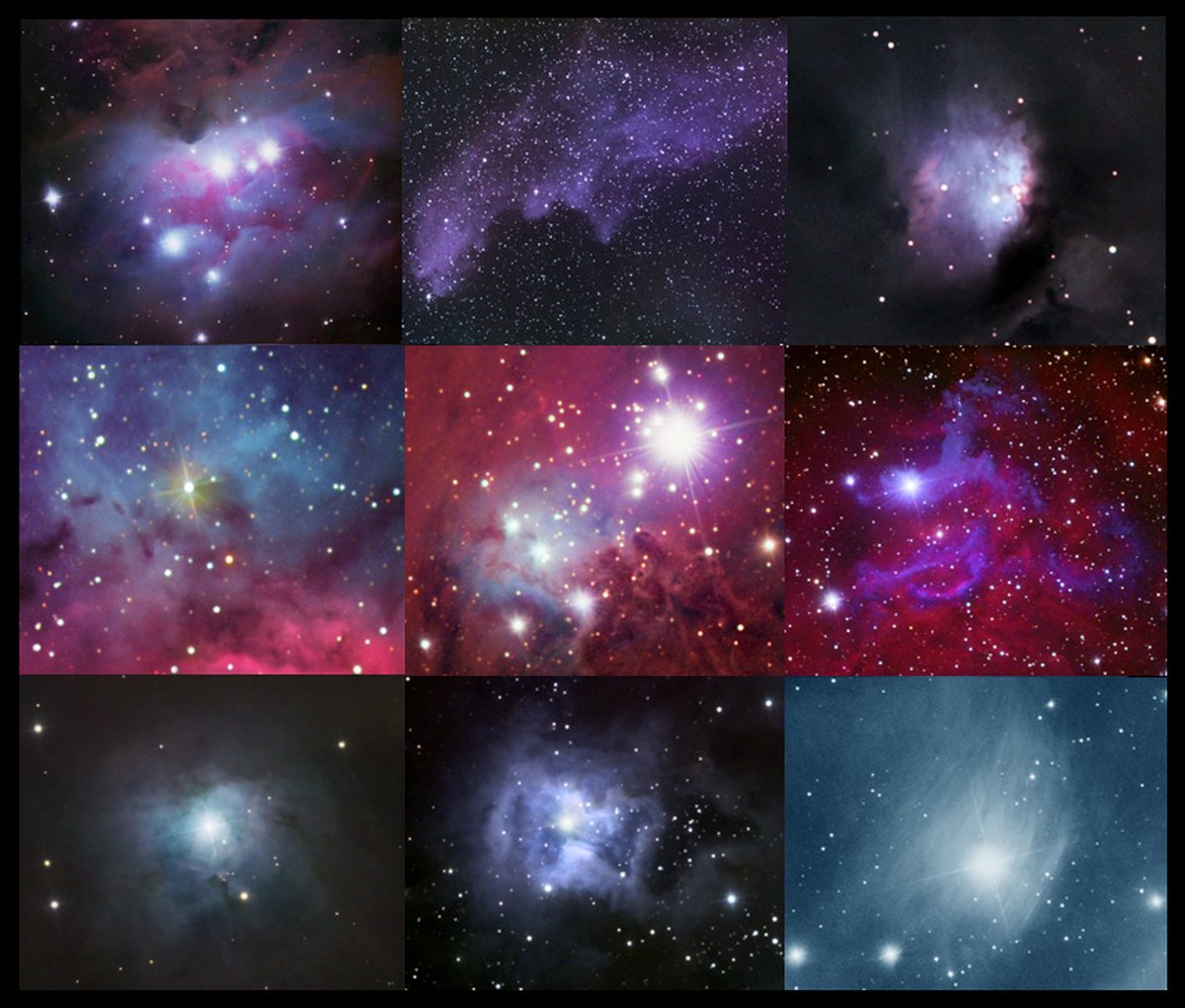 Yıldızlararası toz taneleri çoğu zaman yansıtıcı bir "moda" girer. Parlak bir yıldızın yakınında, bu toz parçacıklarından oluşan bulutlar görünür yıldız ışığının kısa dalga boylarını uzun dalga boylarına göre daha kolay saçar; ortaya da göz alıcı mavi yansıma bulutsuları çıkar. Tozlu, mavi bu yıldız komşuluklarının daha etkileyici dokuz örneğini astrofotoğrafçı Rob Gendler burada bir araya getirmiş. Üst sırada soldan sağa: Avcı (Orion) takımyıldızındaki NGC 1977, IC2118 (Cadı Başı) ve yine Avcı'daki M78 var. Orta sırada: M20 (Trifid), Tekboynuz (Monoceros) takımyıldızındaki NGC 2264 ve IC405 (Alevli Yıldız Bulutsusu) yer alıyor. Alt sırada ise NGC 2023 (Atbaşı'nın yakınlarında), NGC 7023 (İris Bulutsusu) ve son olarak bir toz perdesiyle çevrili parlak yıldız Merope (NGC 1435) bulunuyor. Merope, Ülker'in (Pleiades) Yedi Kız Kardeş'inden biridir.