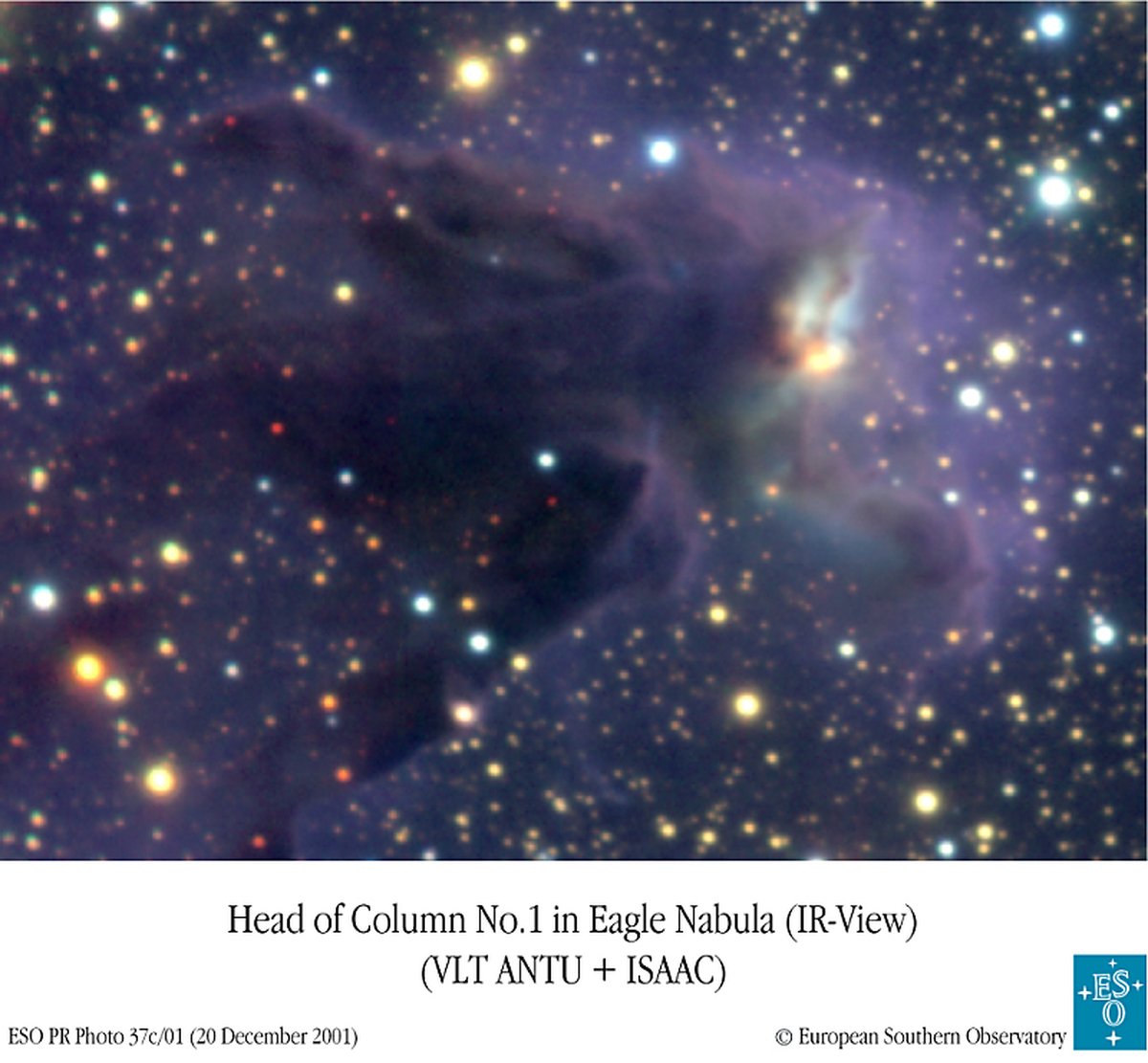 bu geniş alan mozaiğinde de merkezin biraz altında seçiliyor. Onlarla birlikte, sağ üstte NGC 6611 kümesinin iri, parlak, genç yıldızları da görülüyor; bu yıldızların rüzgârları ve ışınımı, tozlu sütunları biçimlendiriyor. Avrupa Güney Gözlemevi’nin 8,2 metrelik Antu teleskobuyla yakın kızılötesi ışıkta üretilen bu geniş alan görüntüsü, sütunları daha saydammış gibi gösteriyor. Çünkü daha uzun