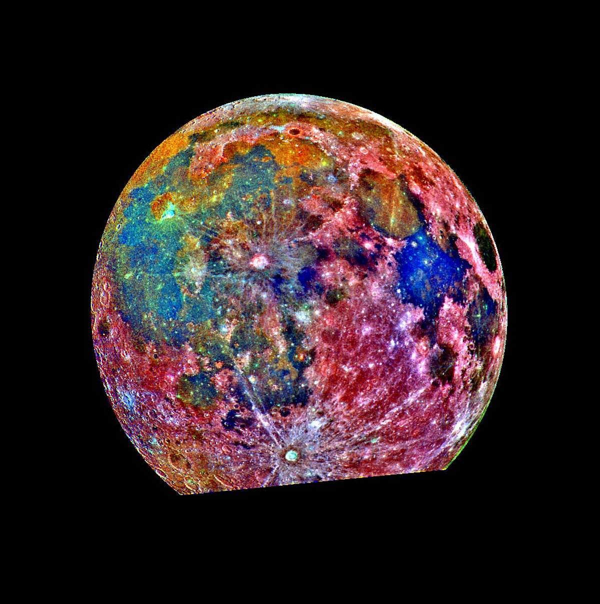 Do you recognize the Earth's Moon when you see it? The crazy, patchwork appearance of the false-color image makes this almost full view of the Moon's familiar near side look very strange. The Sea of Tranquillity (Mare Tranquillitatis) is the bright blue area at right, the Ocean of Storms (Oceanus Procellarum) is the extensive blue and orange area on the left, and white lines radiate from the crater Tycho at bottom center. Recorded in 1992 by the Galileo spacecraft enroute to Jupiter, the picture is a mosaic of 15 images taken through three color filters. The image data were combined in an exaggerated color scheme to emphasize composition differences - blue hues reveal titanium rich areas while orange and purple colors show regions relatively poor in titanium and iron. Multicolor images exploring the Moon's global surface composition were made in 1994 by the Clementine spacecraft.