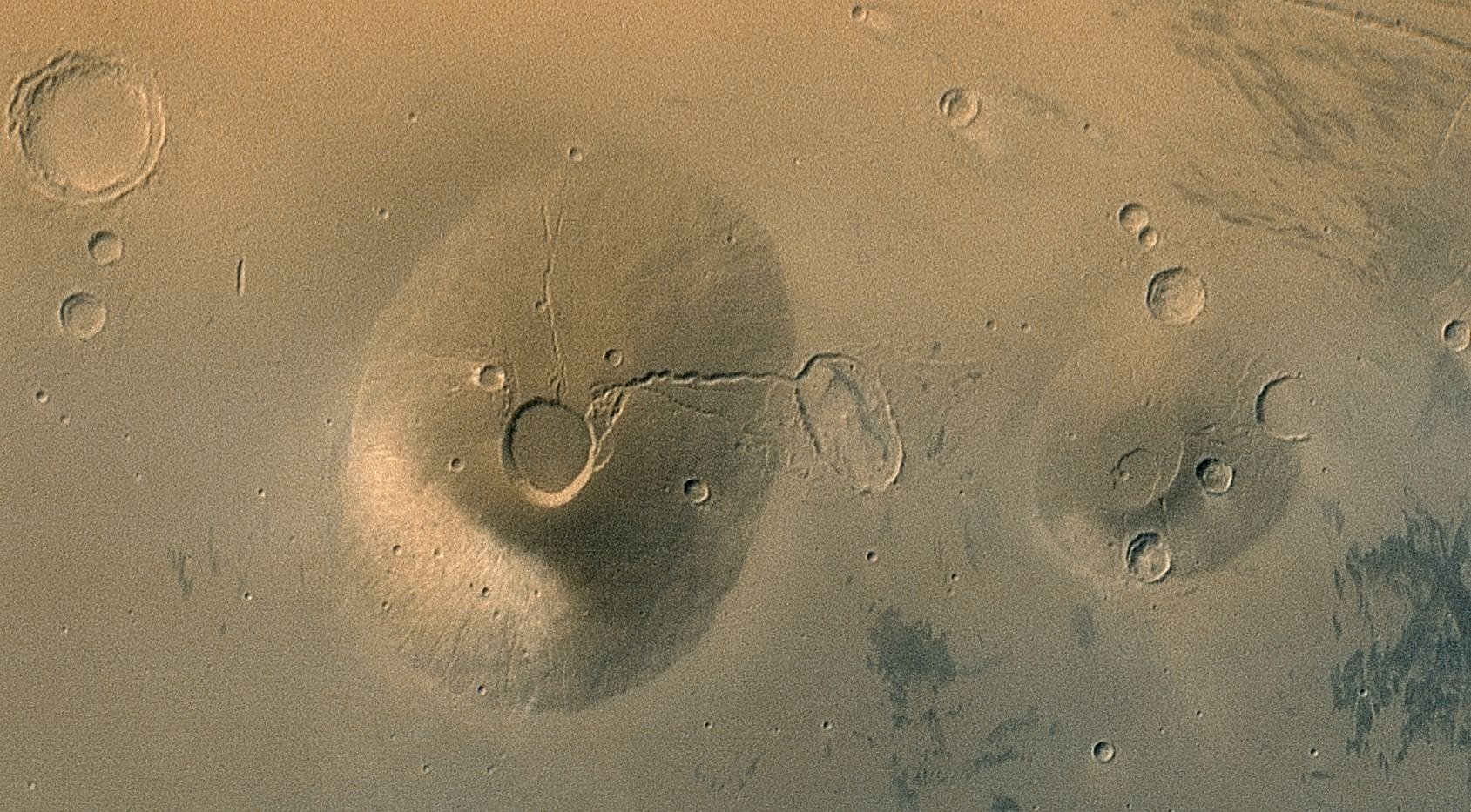Findings of ancient martian microbial fossils in meteorites and liquid water related features on Mars' surface are currently controversial issues. But one thing long established by space-based observations of the Red Planet is the presence of volcanos, as Mars supports some of the largest volcanos in the solar system. This synthetic color picture recorded in March by the Mars Global Surveyor spacecraft shows two of them, Ceraunius Tholus (leftmost) and Uranius Tholus. Found north of the Tharsis region of truly large martian volcanos, these are actually two relatively small volcanos, Ceraunius Tholus being only about the size of the Big Island of Hawaii on planet Earth. Impact craters which overlay the volcanic martian terrain indicate that these volcanos are themselves ancient and inactive. North is to the right and the scene is illuminated by sunlight from the top left. A light region of dust deposited by recent global dust storms lies on the lower left flank of Ceraunius Tholus, whose summit crater is about 25 kilometers across.