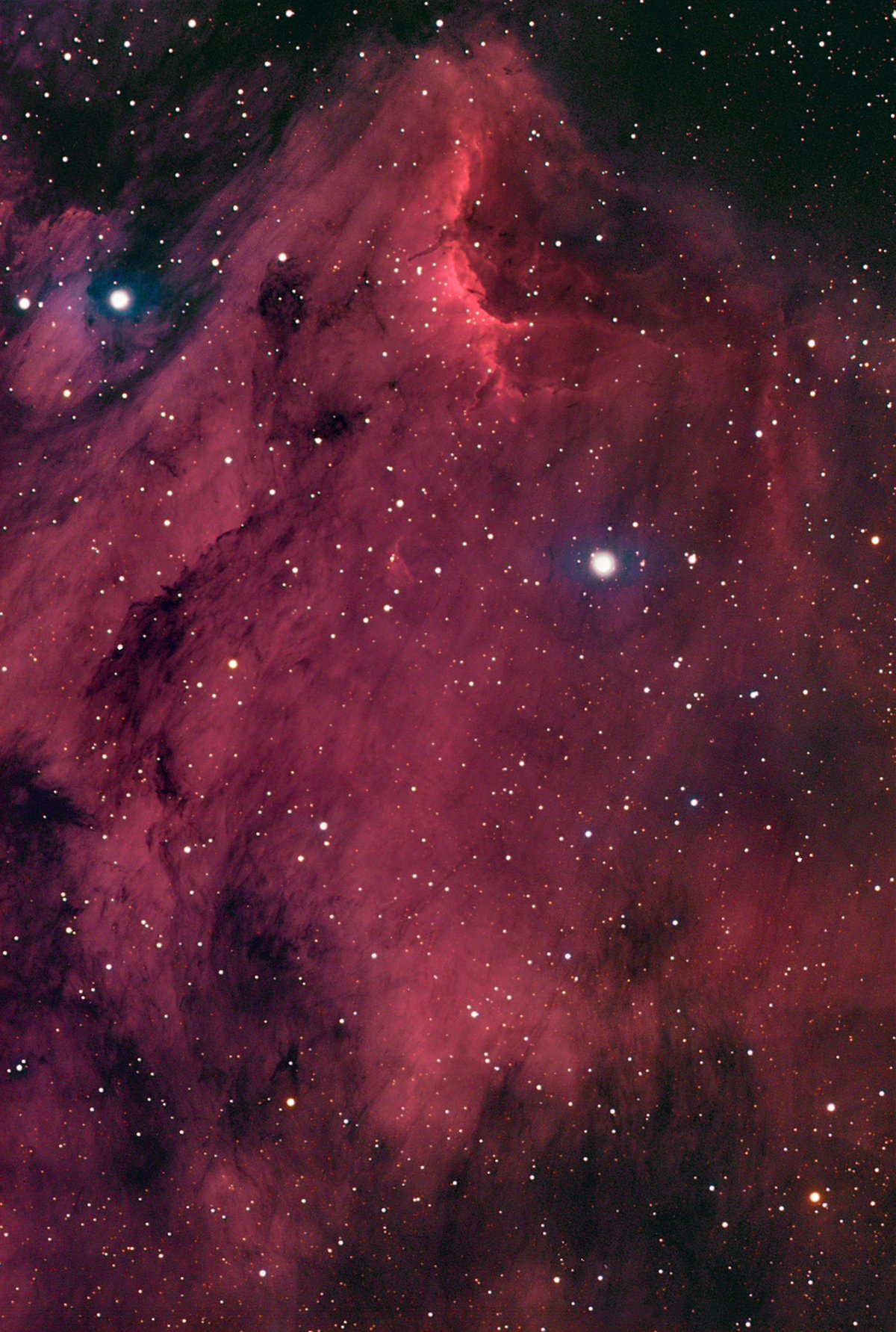 It's easy to get lost following the intricate filaments in this stunningly detailed image of faint supernova remnant Simeis 147. Seen towards the constellation Taurus it covers nearly 3 degrees (6 full moons) on the sky corresponding to a width of 150 light-years at the stellar debris cloud's estimated distance of 3,000 light-years. On three separate nights in December 2001 and January 2002 astronomer Steve Mandel accumulated a total of over eight hours of exposure time to compose this image. He used an astronomical CCD camera, telephoto lens, and his specially designed adapter to allow such wide-field digital imaging. He also used a narrow H-alpha filter to transmit only the the light from recombining hydrogen atoms in the expanding nebulosity, defining the regions of shocked, glowing gas. This supernova remnant has an apparent age of about 100,000 years (light from the original explosion first reached Earth 100,000 years ago) but it is not the only aftermath of the massive stellar explosion. The cosmic catastrophe also left behind a spinning neutron star or pulsar, all that remains of the star's dense core.