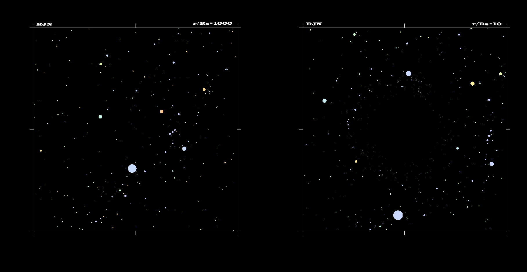 What would you see if you went right up to a black hole? Above are two computer generated images highlighting how strange things would look. On the left is a normal star field containing the constellation Orion. Notice the three stars of nearly equal brightness that make up Orion's Belt. On the right is the same star field but this time with a black hole superposed in the center of the frame. The black hole has such strong gravity that light is noticeably bent towards it - causing some very unusual visual distortions. In the distorted frame, every star in the normal frame has at least two bright images - one on each side of the black hole. In fact, near the black hole, you can see the whole sky - light from every direction is bent around and comes back to you. Black holes are thought to be the densest state of matter, and there is indirect evidence for their presence in stellar binary systems and the centers of globular clusters, galaxies, and quasars.