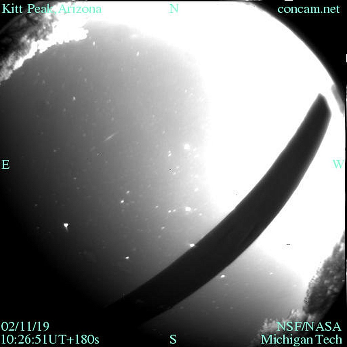 Is Leo leaking? Leo, the famous sky constellation visible on the left of the above all-sky photograph, appears to be the source of all the meteors seen in last year's Leonids Meteor Shower. That Leonids point back to Leo is not a surprise - it is the reason that this November meteor shower is called the Leonids. Sand-sized debris expelled from Comet Tempel-Tuttle follows a well-defined orbit about our Sun, and the part of the orbit that approaches Earth is superposed in front of the constellation Leo. Therefore, when Earth crosses this orbit, the radiant point of falling debris appears in Leo. Over 100 bright meteors can be seen in the above half-hour exposure. The intensity of the Leonid Meteor Shower in 2002 is uncertain but may approach one per second for some locations on November 18 and 19.
