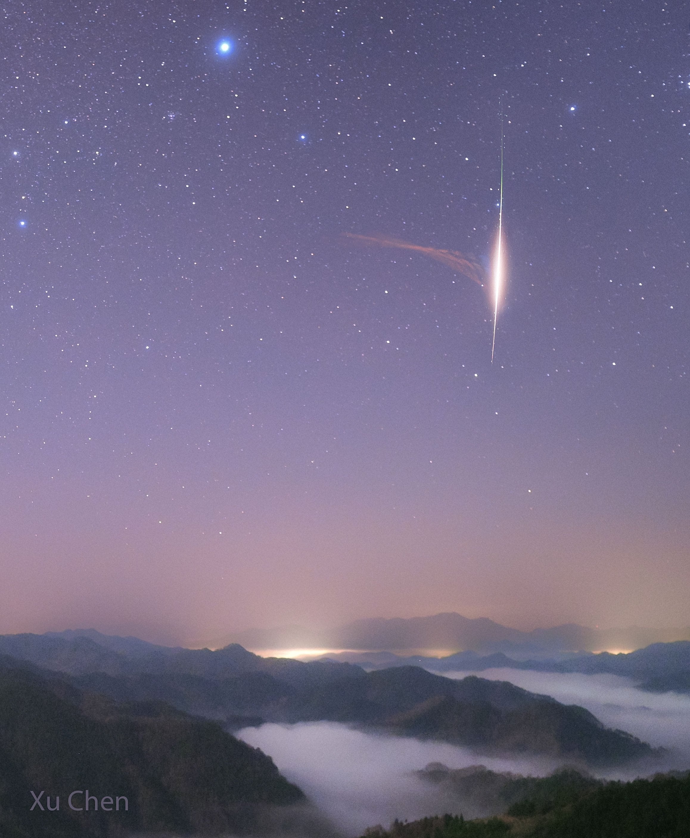 Streaking high above diffuse clouds -- but well in front of distant stars -- are sand-sized bits of an ancient comet: meteors. These bits flaked off Comet Tempel-Tuttle during its pass through the inner Solar System about 150 years ago. Far in the background are stars toward the constellation of Ursa Major. The above image is digital combination of 12 exposures taken on the morning of November 19 from Florida, USA. Observers there reported a strong peak in faint meteors between 5:30 and 6:00 EST, with a particularly strong minute coming at 5:46 EST when 22 Leonid meteors were counted. The likely less impressive Geminid meteor shower will peak over the next three nights.