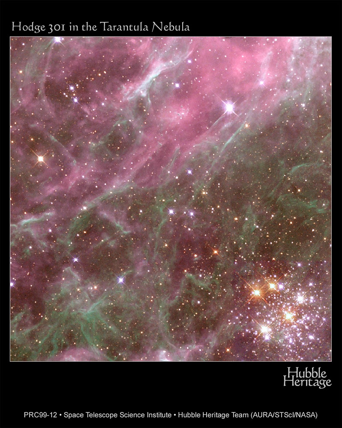 The star cluster at lower right, cataloged as Hodge 301, is a denizen of the Tarantula Nebula. An evocative nebula in the southern sky, the sprawling cosmic Tarantula is an energetic star forming region some 168,000 light-years distant in our neighboring galaxy the Large Magellanic Cloud. The stars within Hodge 301 formed together tens of millions of years ago and as the massive ones quickly exhaust their nuclear fuel they explode. In fact, the giant stars of Hodge 301 are rapidly approaching this violent final phase of stellar evolution - known as a supernova. These supernova blasts send material and shock waves back into the nebular gas to create the Tarantula's glowing filaments also visible in this Hubble Space Telescope Heritage image. But these spectacular stellar death explosions signal star birth as well, as the blast waves condense gas and dust to ultimately form the next generation of stars inside the Tarantula Nebula.