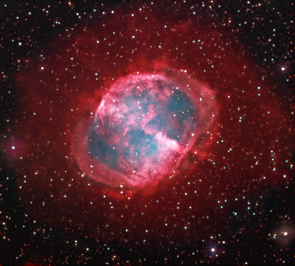 In 1764, French astronomer Charles Messier sighted this gorgeous cosmic cloud which he described as an oval nebula without stars. Cataloged as M27, it is now popularly known as the Dumbbell Nebula, not for its substandard academic performance but for the elongated shape, like a bar with weights on each end, which first caught Messier's eye. This deep image of the bright planetary nebula does reveal the Dumbell's central star though, and an array of foreground and background stars toward the sly constellation Vulpecula. The picture is a composite that includes 8 hours of exposure through a filter designed to record only the light of hydrogen atoms, tracing the intricate details of the nebula's faint outer halo which spans light-years. Thought to be an example of the fate awaiting our own Sun 5 billion years hence, the Dumbbell Nebula is about 1,200 light-years away.