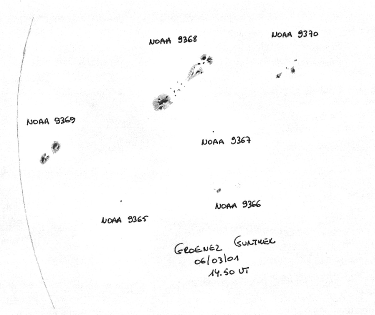 Awash in a sea of plasma and anchored in magnetic fields, sunspots are planet-sized, dark islands in the solar photosphere, the bright surface of the Sun. Before the enlightened(!) age of cameras, solar observers created detailed drawings of sunspots as they changed and progressed across the visible solar disk. But contemporary observers also regularly use this time-honored method of monitoring sunspots. In this sketch from March 6th 2001, astronomer Gunther Groenez has faithfully recorded the intriguing shapes and shades of major visible sunspot groups and labeled them according to their NOAA active region number. Solar north is up and east to the right. Groenez' technical equipment includes H and 2H pencil leads for the sunspot umbra (dark) and penumbra (light) areas respectively. Want to draw sunspots too? Now's your chance as two large sunspot groups are presently making their way across the solar disk. Activity associated with these large sunspots may trigger aurora in the coming days.