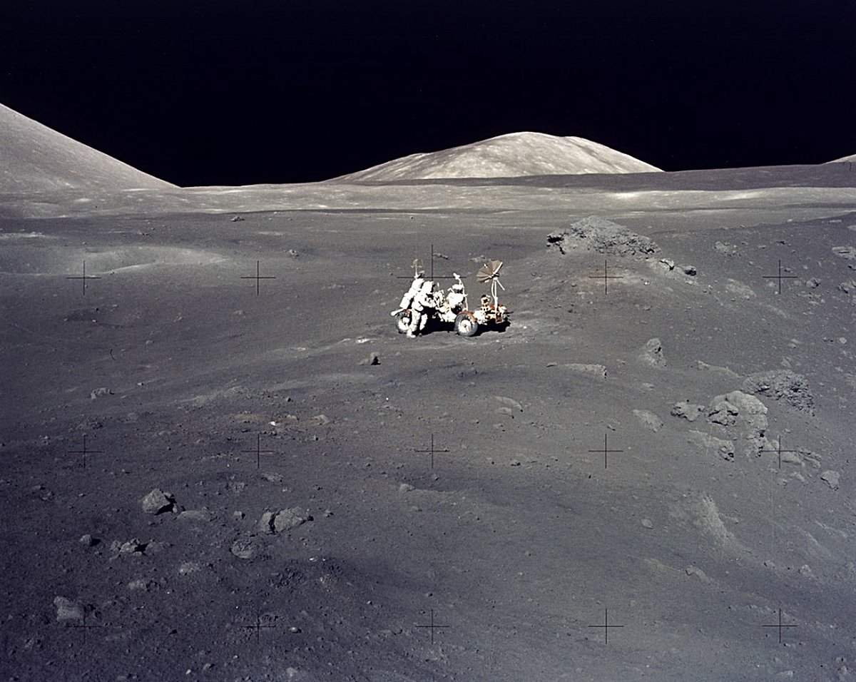 Buzz Aldrin, Apollo 11 Lunar Module pilot and the second human to walk on the Moon, described the lunar landscape as "a magnificent desolation". Dramatic pictures from the Apollo missions to the lunar surface testify to this apt turn of phrase. Near the Apollo 17 landing site, Family Mountain (center background) and the edge of South Massif (left) frame the lunarscape in this photo of astronaut Harrison Schmitt working alongside the lunar roving vehicle. Schmitt and fellow astronaut Eugene Cernan were the last to walk on this magnificent desolation.