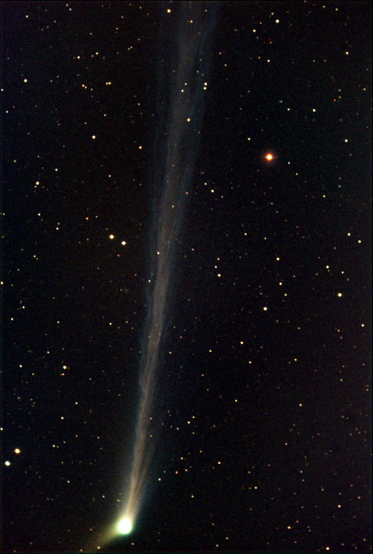 Discovered by the the Lincoln Near Earth Asteroid Research (LINEAR) project in October of 2002, comet C/2002 T7 is now visiting the inner solar system, making its closest approach (see animation by L. Koehn) to the Sun tomorrow, April 23rd. Emerging from the solar glare, the comet is now just visible to the unaided eye in the constellation Pisces, near the eastern horizon in morning twilight. In this gorgeous telescopic view recorded before dawn yesterday, the clearly active comet has developed an extensive, complex tail extending over 2 degrees in the anti-sunward direction, and a pronounced anti-tail or anomalous tail. Later next month this comet should appear brighter, making its closest approach to planet Earth on May 19th. In fact, it could share southern skies with another naked-eye comet, also anticipated to brighten in May, designated C/2001 Q4 (NEAT).